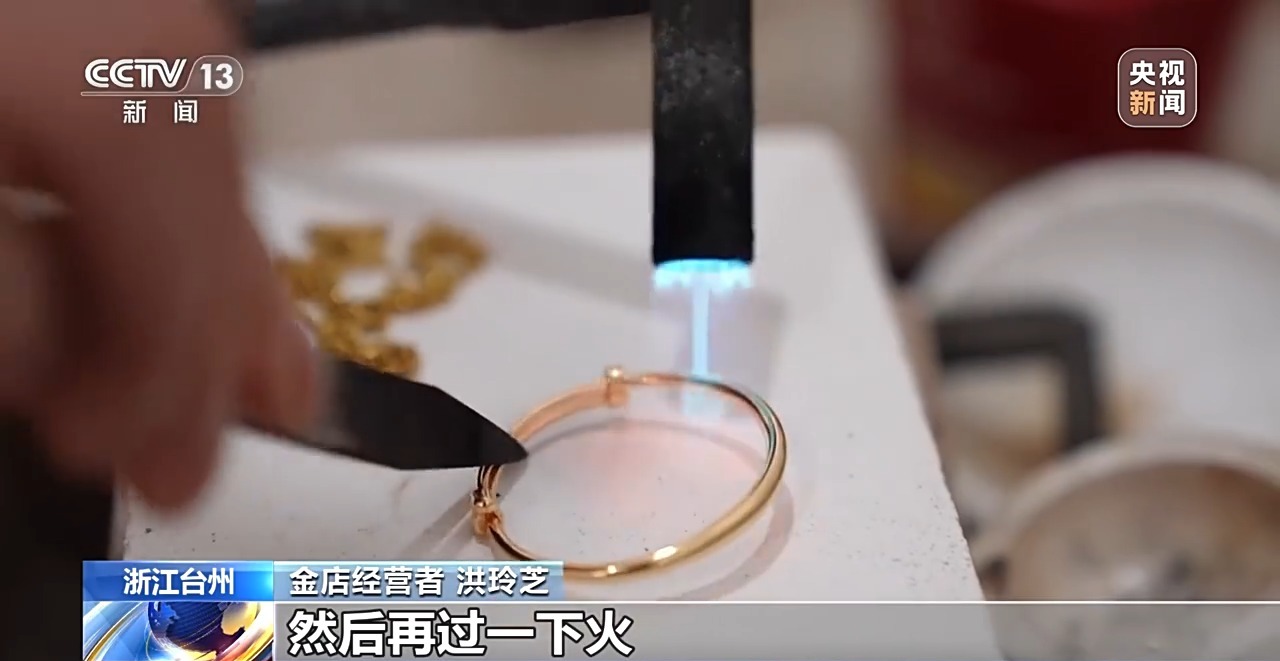 金店经营者 洪玲芝:我们先称一下重量,然后再过一下火,过火之后,用那个抛光机清洗,抛光机里面是那个钢珠,加了洗洁精跟抛光粉,然后洗完后再对一下重量。