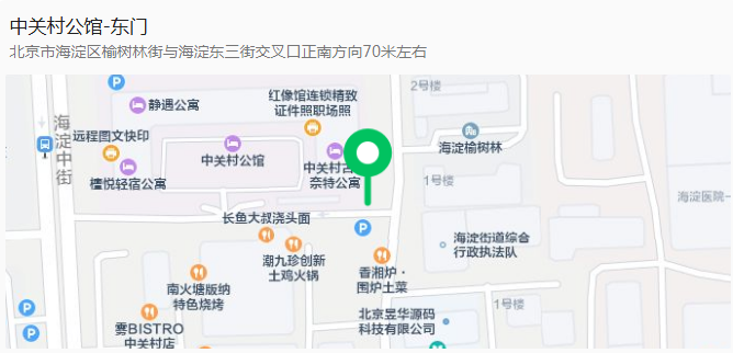 ◉周边停车场:中关村公馆地上停车场,海淀东三街路侧停车场,榆树林街路侧停车场,紫光园(海淀南路店)门前停车场,海淀医院地上停车场。