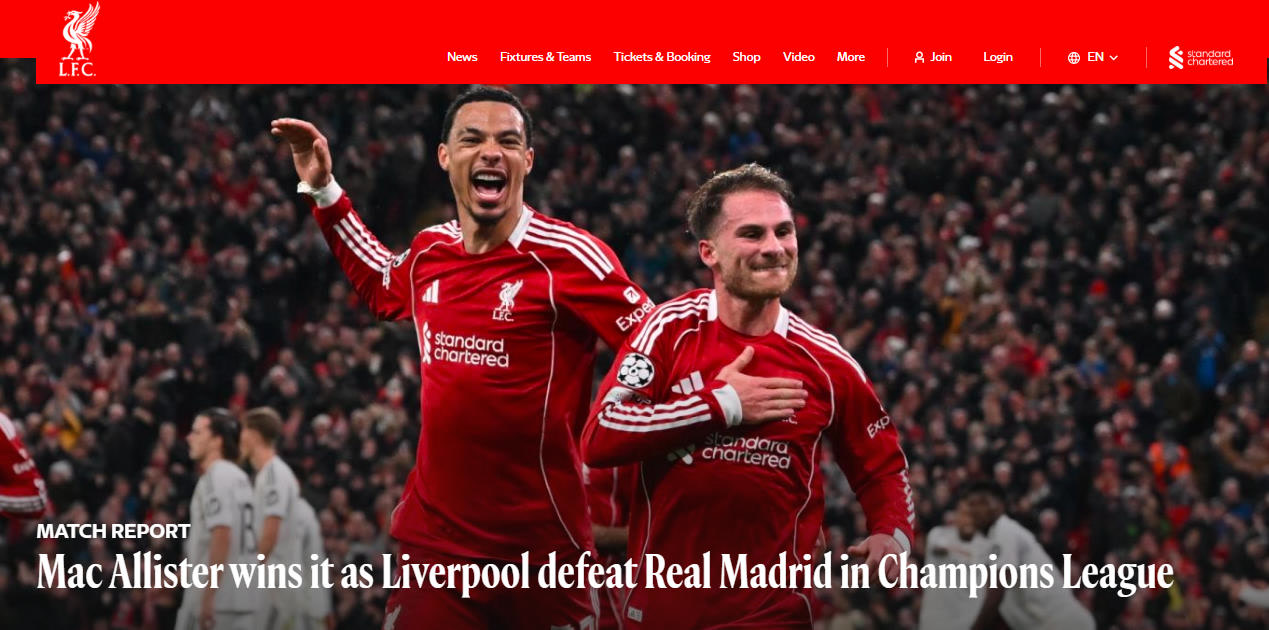 利物浦队上周末在联赛击败阿斯顿维拉队,终于走出连败阴霾。本场面对此前在欧冠赛场三连胜的皇马,英超冠军打出气势,上半场就多次创造出得分机会,但比利时门神库尔图瓦状态神勇,多次完成精彩扑救力保“银河战舰”城门不破。下半场第61分钟,麦卡利斯特接索博斯洛伊任意球助攻头球破门,利物浦队终于攻破库尔图瓦十指关,并凭借这个进球在主场奏凯。