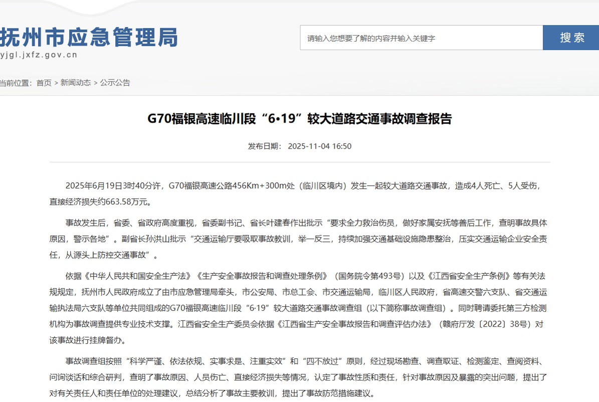 江西抚州市应急管理局11月4日发布《G70福银高速临川段“6·19”较大道路交通事故调查报告》。2025年6月19日3时40分许,G70福银高速公路456Km+300m处(临川区境内)发生一起较大道路交通事故,造成4人死亡、5人受伤。