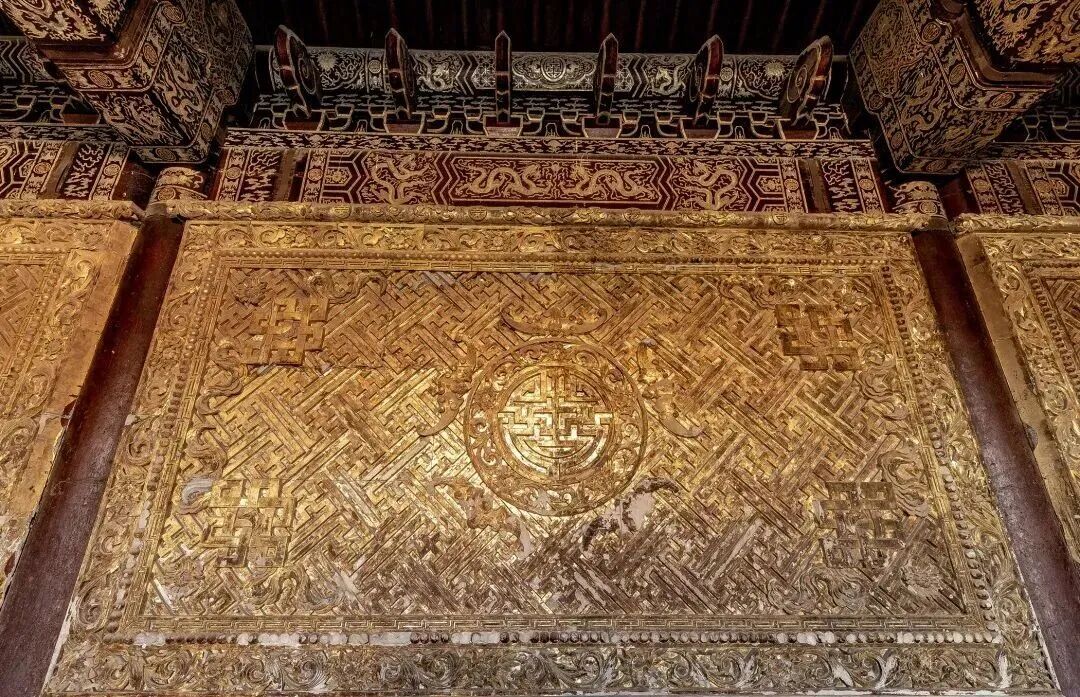 三座大殿最为奢侈豪华之处的另一种体现便是殿内殿外采用鎏金、贴金、扫金等手法,将黄金作为一种装饰,这无不体现了工匠的奇思妙想和精巧技艺。慈禧陵内的彩画更是新颖而独特,打破传统规制,全部改用等级最高的金龙和玺彩画。
