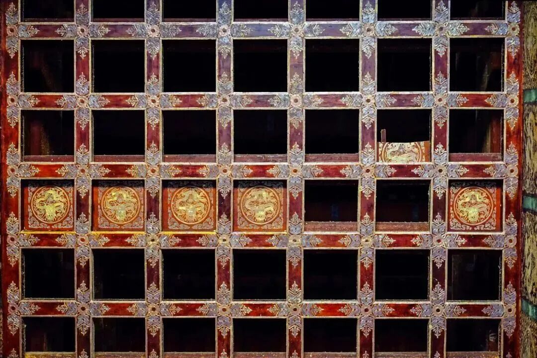 除此之外,在其隆恩殿及东西配殿的墙壁砖雕也是十分精美,别具一格。大殿的墙壁磨砖对缝,干摆至顶;内壁上身用方砖陡砌干摆,采用高浮雕技法,雕刻有“五蝠捧寿”,佛教“卍”字不到头,以及盘肠等吉祥图案,寓意“福寿绵长,万福万寿”。心思巧妙的工匠更是在浮雕上扫以赤金和黄金,两种颜色交相辉映,显得整座大殿金碧辉煌。在大殿的正上方,每块天花板的正中都有一条用黄金打造的金龙镶在上面,每条金龙重一两,仅天花板所用黄金达到五百多两,在当时也是一番奇景。