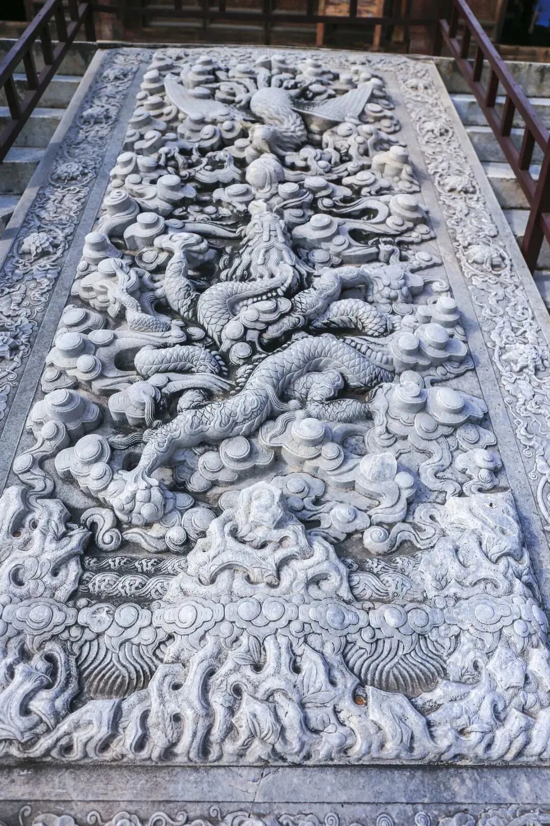 慈禧陵石雕不仅石料一律采用上好的汉白玉,图案更是绝无仅有。隆恩殿前丹璧石的石雕以“龙凤戏珠”为主,但却是凤在上,龙在下,把慈禧皇太后女权主义思想体现的淋漓尽致。并且在凤冠、凤嘴、龙须、龙爪等十处都是通透异常,此工艺称为透雕,在当时生产力低下,工具简单的情况下,纯手工制作出如此精美的石雕实属不易。在“龙凤戏珠”的周围环以海水江崖和祥云等吉祥图案,采用高浮雕手法,层次感鲜明。整体石雕立体生动,活灵活现,足见慈禧对身后之事的重视。