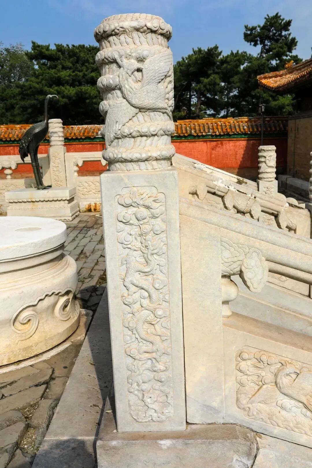此外,与其他陵寝栏板和望柱雕刻不同的是,慈禧陵望柱柱头上均雕刻有一只翔凤,而柱身内外各雕刻一条龙,并且栏板上的雕刻也是凤在前面飞,龙在后面追,显示出了女主当政的鲜明时代特征。所有石雕形象逼真,技艺高超,令人叹为观止,在全国可以说是“独一无二”的,成为了慈禧陵一绝——“石雕之绝”。