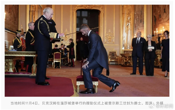 据英国广播公司(BBC)、《卫报》等媒体报道,英国球星、前英格兰国家队队长大卫·贝克汉姆当地时间11月4日在温莎城堡举行的授勋仪式上被英国国王查尔斯三世封为爵士。《卫报》称,贝克汉姆因其在体育与慈善领域的贡献而获得表彰,他称获得这一荣誉是职业生涯中“最自豪的时刻”。