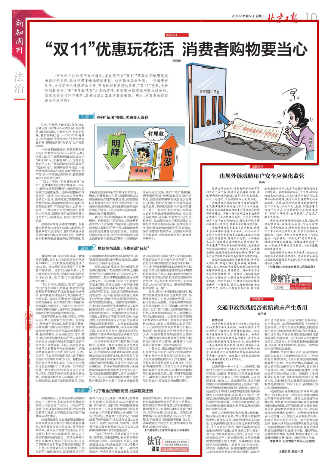 “双11”购物中,消费者有公平交易权、知情权、自主选择权,有权要求商家依约履行合同。商家违约,可要求其双倍返还定金;构成价格欺诈的,可要求商家增加赔偿金额,退一赔三。除特殊商品外,网购商品不满意还有七日无理由退货的权利。商家须明码标价,明确区分尾款和预售券后价并提示消费者,按照约定价格结算尾款,以其承诺的优惠提供商品,明确提示限时优惠的时间,按约定发货,保证质量。市场监督管理部门应规范经营者明码标价行为,压实平台责任,畅通投诉渠道,及时打击尾款涨价的违法行为,维护市场价格秩序,保证公平交易。