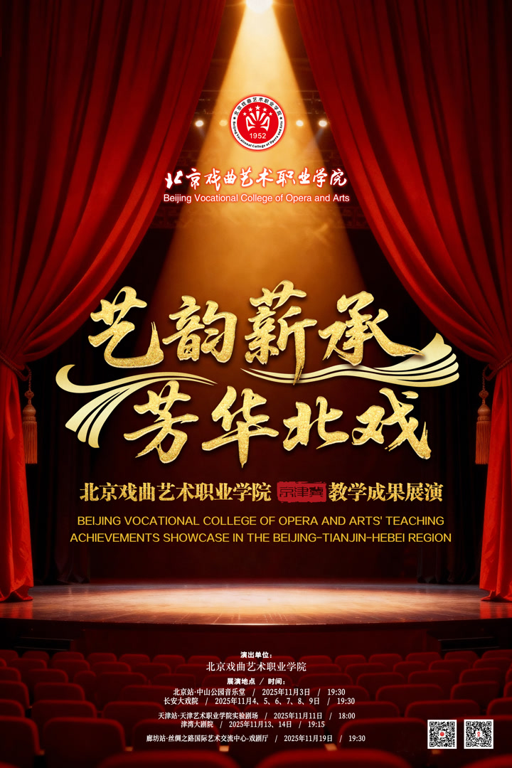 本次展演活动已于2025年10月21日随着舞蹈系“艺术点亮乡村”——赴怀柔四渡河村舞蹈专场演出拉开帷幕,11月3日至11月19日,围绕“艺韵薪承、芳华北戏”主题,精心策划五大板块演出:京剧培优折子戏专场、纪念荀慧生诞辰125周年专场、音乐会专场、评剧名段专场、曲艺专场演出。这不仅是对北戏近年来教学成果的集中检阅,更是艺术职业教育与社会文化生活的深度融合。