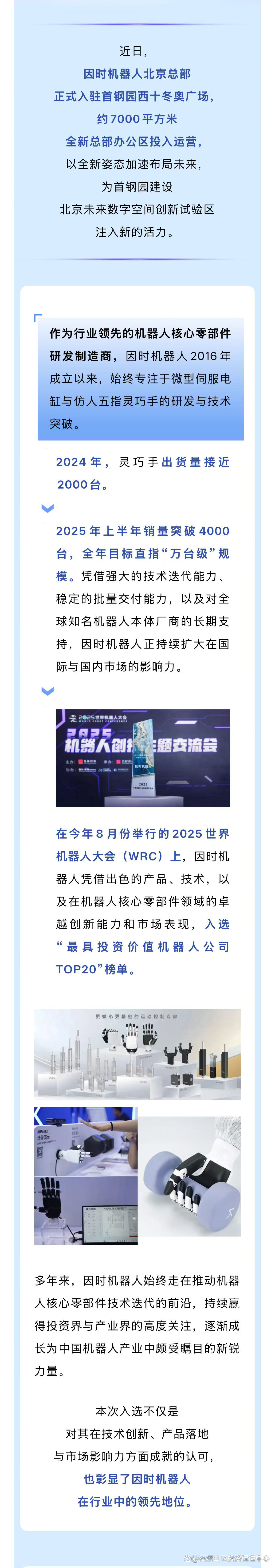 灵巧手,启新程!因时机器人北京总部入驻石景山首钢园