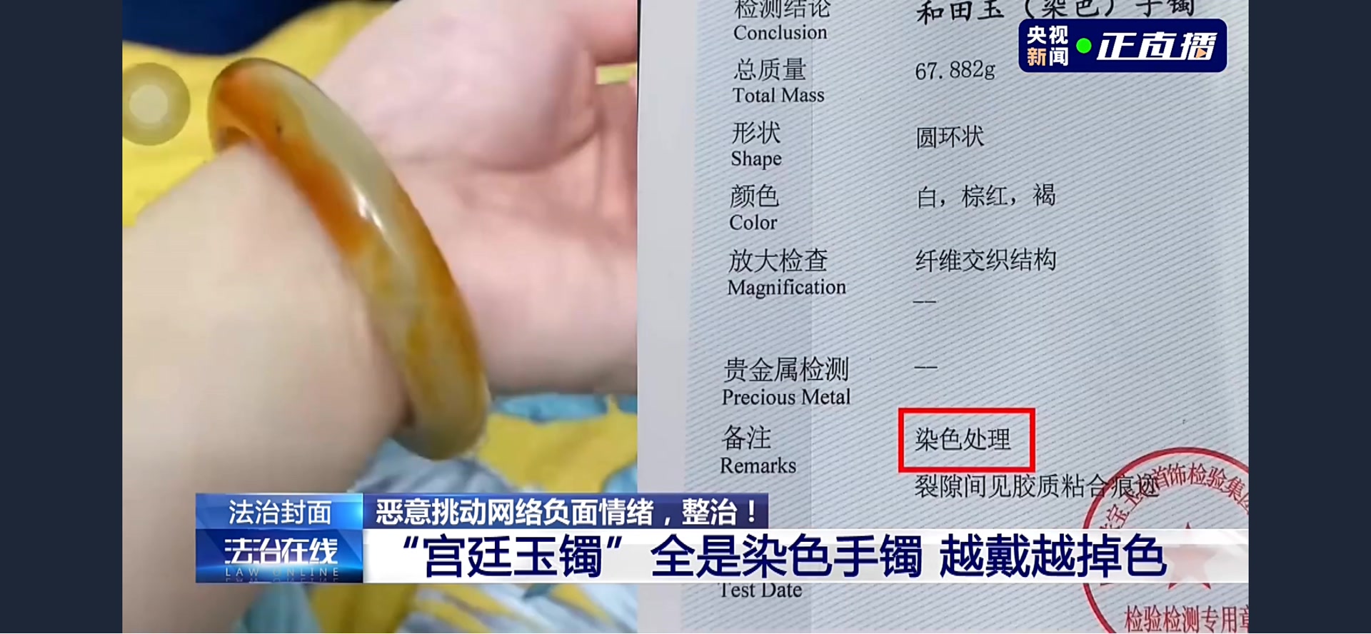 然而,不少消费者在购买“柴怼怼”销售的玉镯后发现,玉镯开始出现越戴颜色越浅的情况。有消费者将手镯送到权威机构进行检测,检测结果显示玉镯为染色手镯。