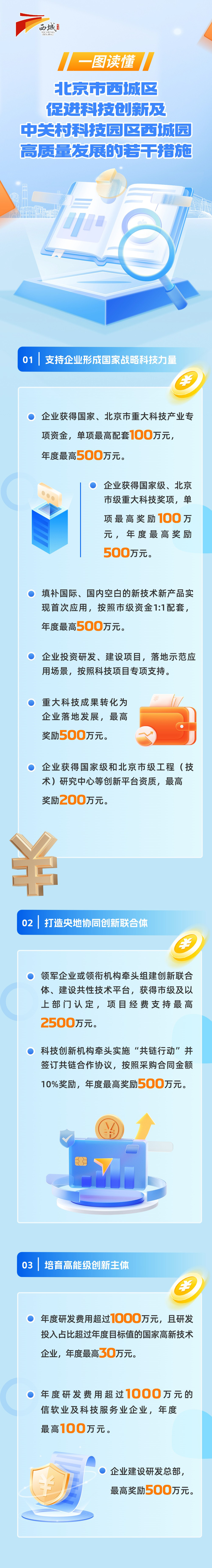 单项最高补助达2500万元、提升12项存量条款额度……近日,西城区重磅发布《北京市西城区促进科技创新及中关村科技园区西城园高质量发展的若干措施》(简称“科创十二条”),聚焦科技创新以更全链条、更高额度的支持,为区域科技企业高质量发展按下“加速键”,助力首都功能核心区打造科创高地。