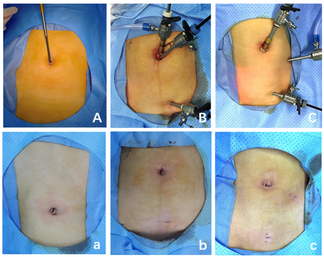 A:经脐部单切口阑尾切除术;a:单切口术后展示
