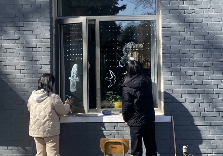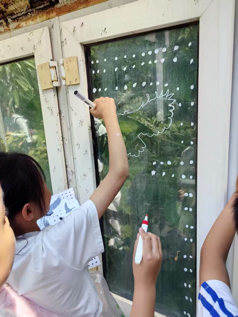 为了避免类似的悲剧再次上演,自然教育部的老师们自发组织了一场“防鸟撞”活动。大家查阅了相关资料后,在8号楼2层的窗户边,用白色油性笔在玻璃上画了圆点矩阵。此后的两年间,自然教育部也常常举办相关防鸟撞教育。在这一过程中,先后有150余名学生拿起画笔,跟随老师一起在窗户上描绘图案,为教室的玻璃做了防鸟撞改造。