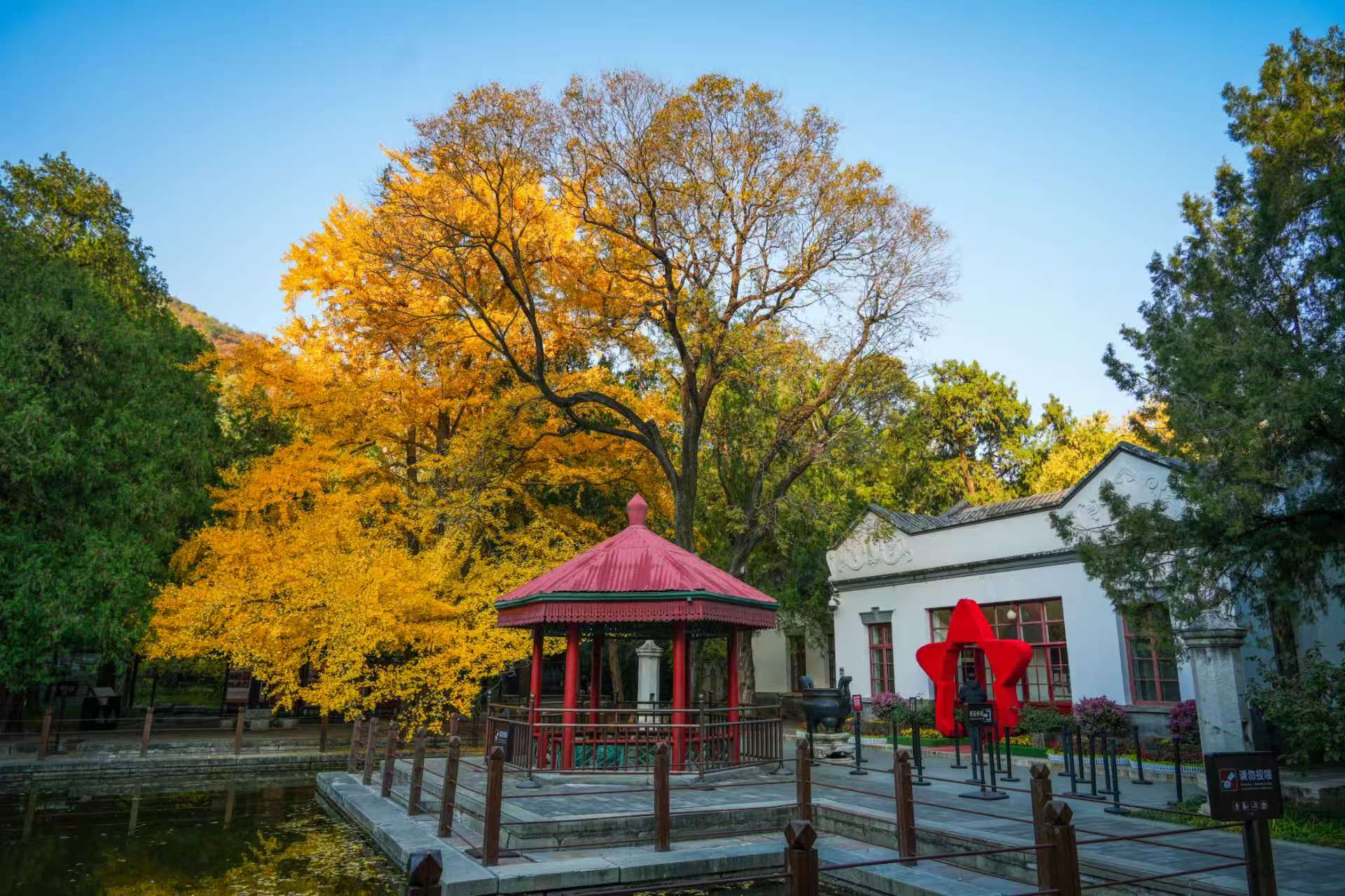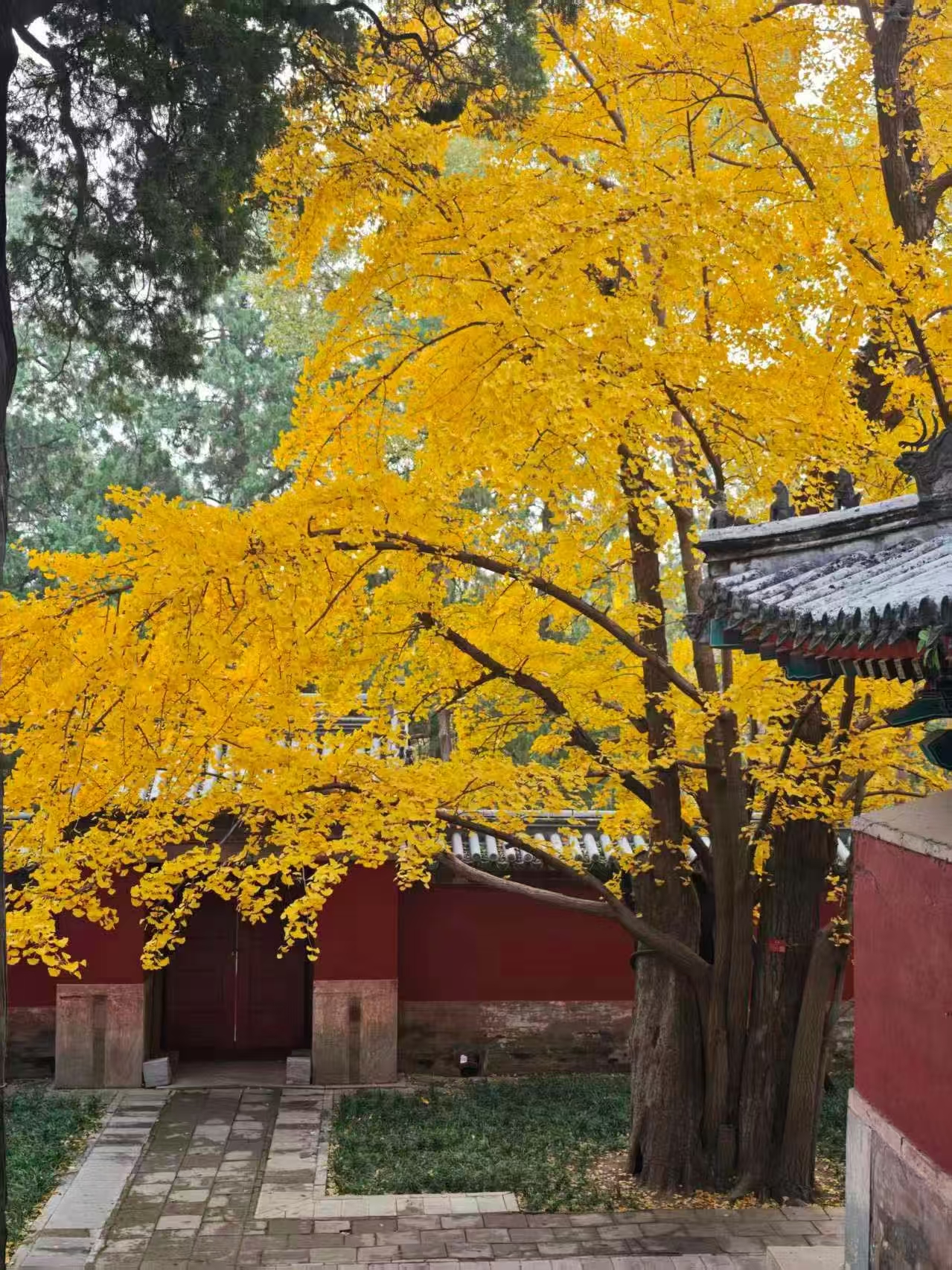 碧云寺的秋日清幽,不仅在于翠竹掩映,更藏在几处韵味独特的银杏景致中。钟鼓楼两侧的银杏高大挺拔,金黄的树冠与楼阁相依,每当秋风拂过,落叶如蝶,平添了几分灵动。行至深处的含青斋与涵碧斋,这里的银杏与精巧的庭院相伴,树影婆娑,洒下一地碎金,营造出“庭院深深深几许”的独有韵味。