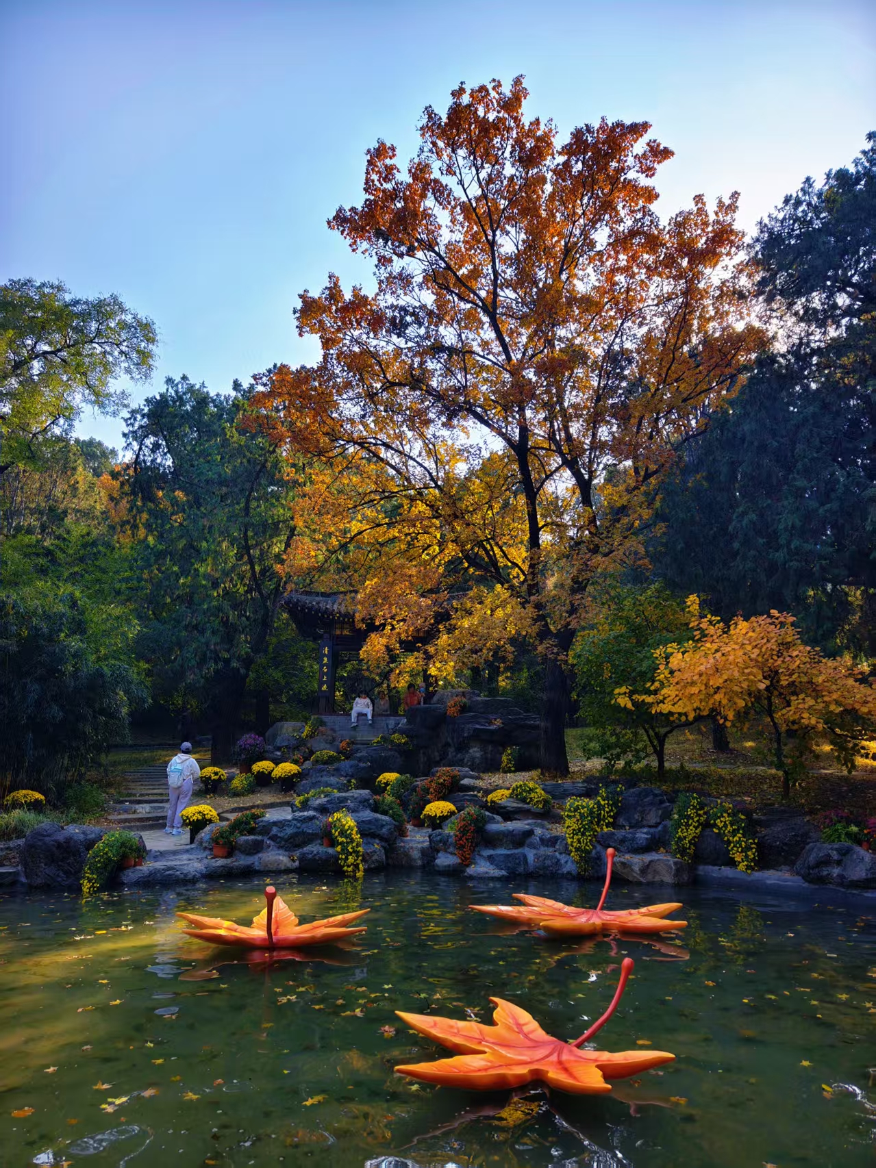 彩叶缀枝、落叶翩跹,银杏、元宝枫与古松相映,秋韵与古意交融,漫步其间,仿佛走进一幅流动的古典画卷。