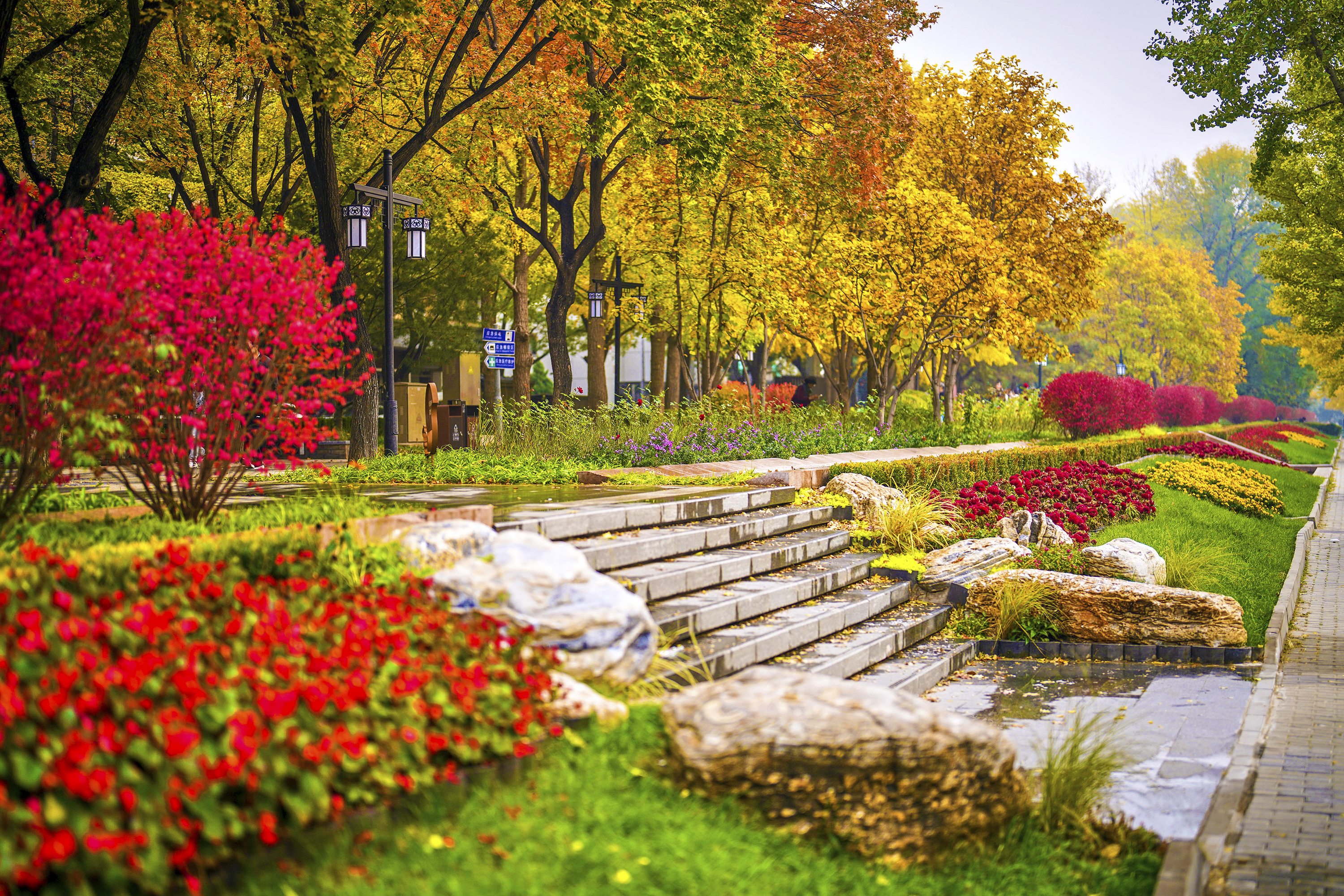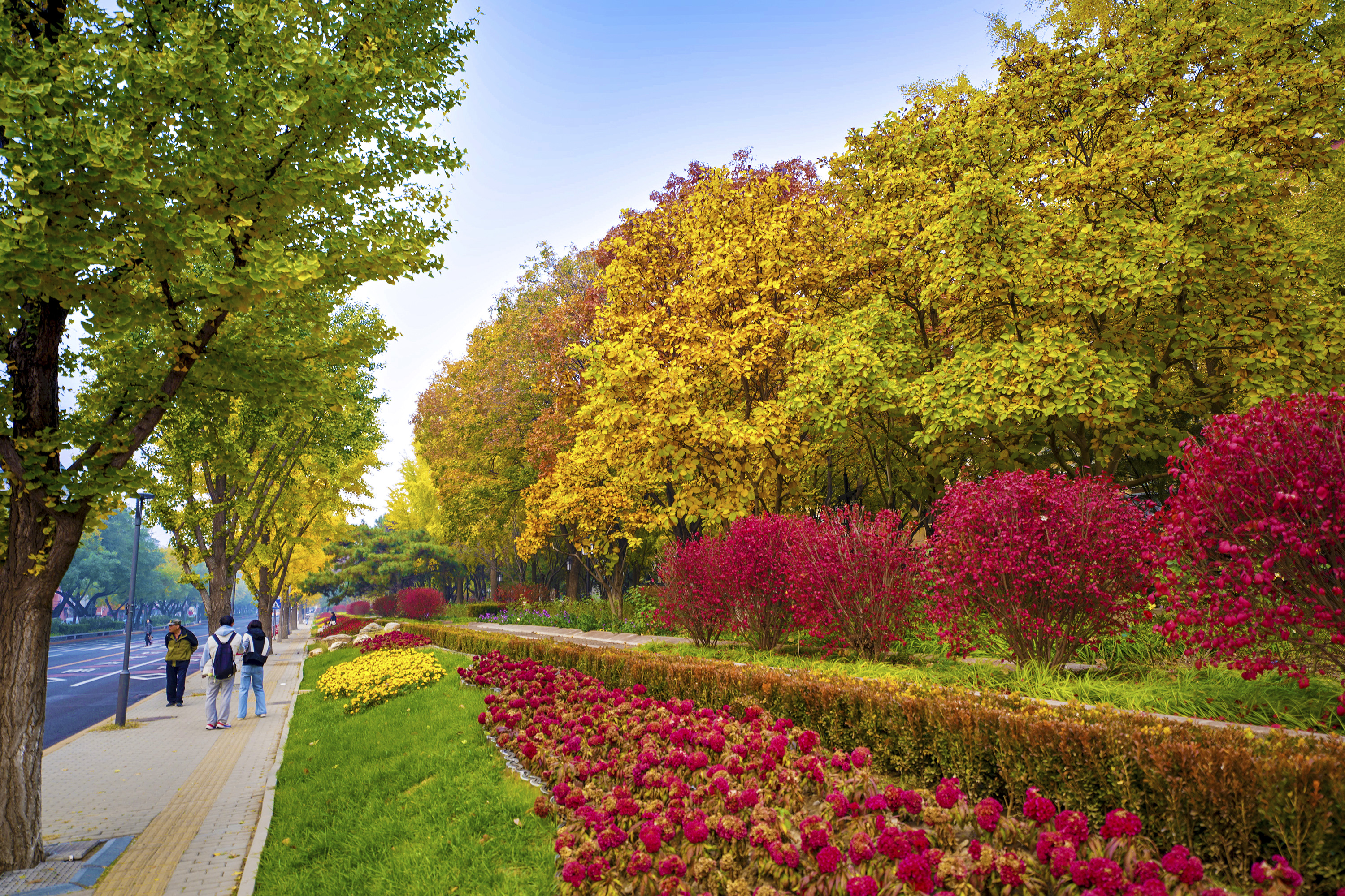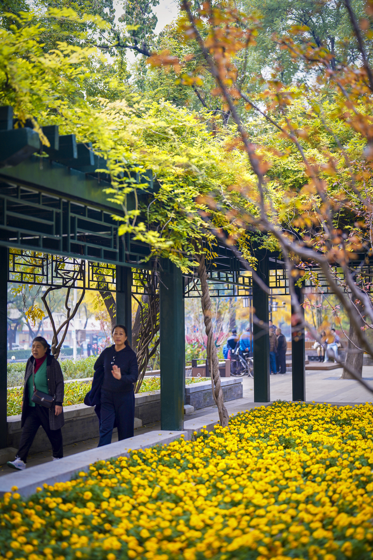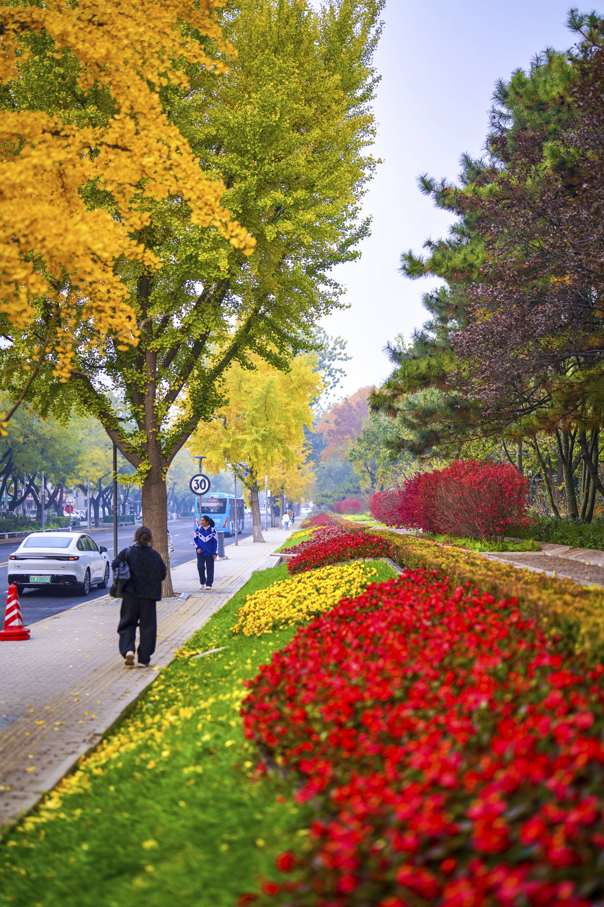 沿步道徐行,仿佛走入色彩的秘境——银杏的金、松柏的绿、黄栌的橙、元宝枫的红,层层晕染,交织成秋日的底色。各色应季花卉点缀其间,与林木相映,碰撞出丰富而斑斓的视觉韵律。