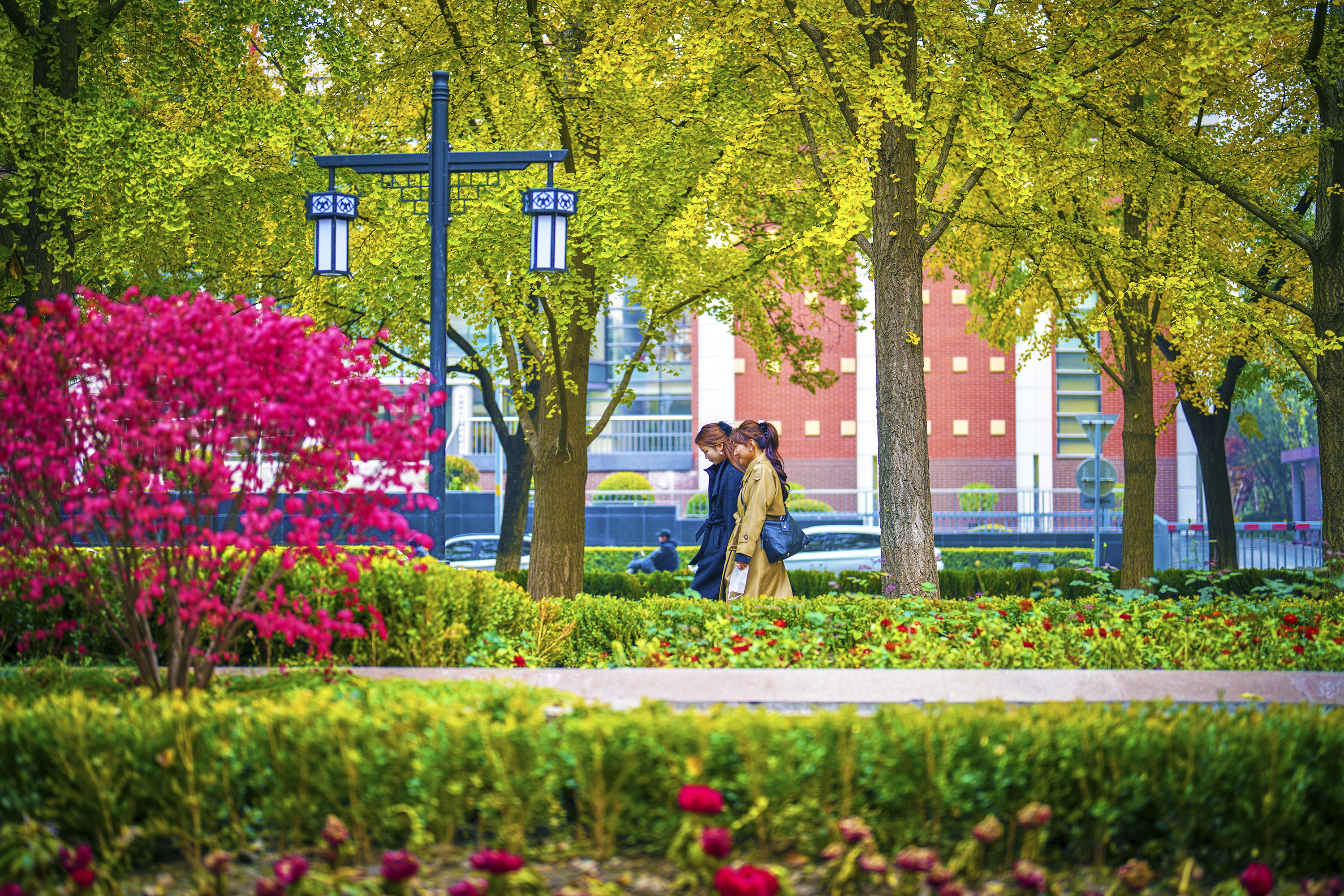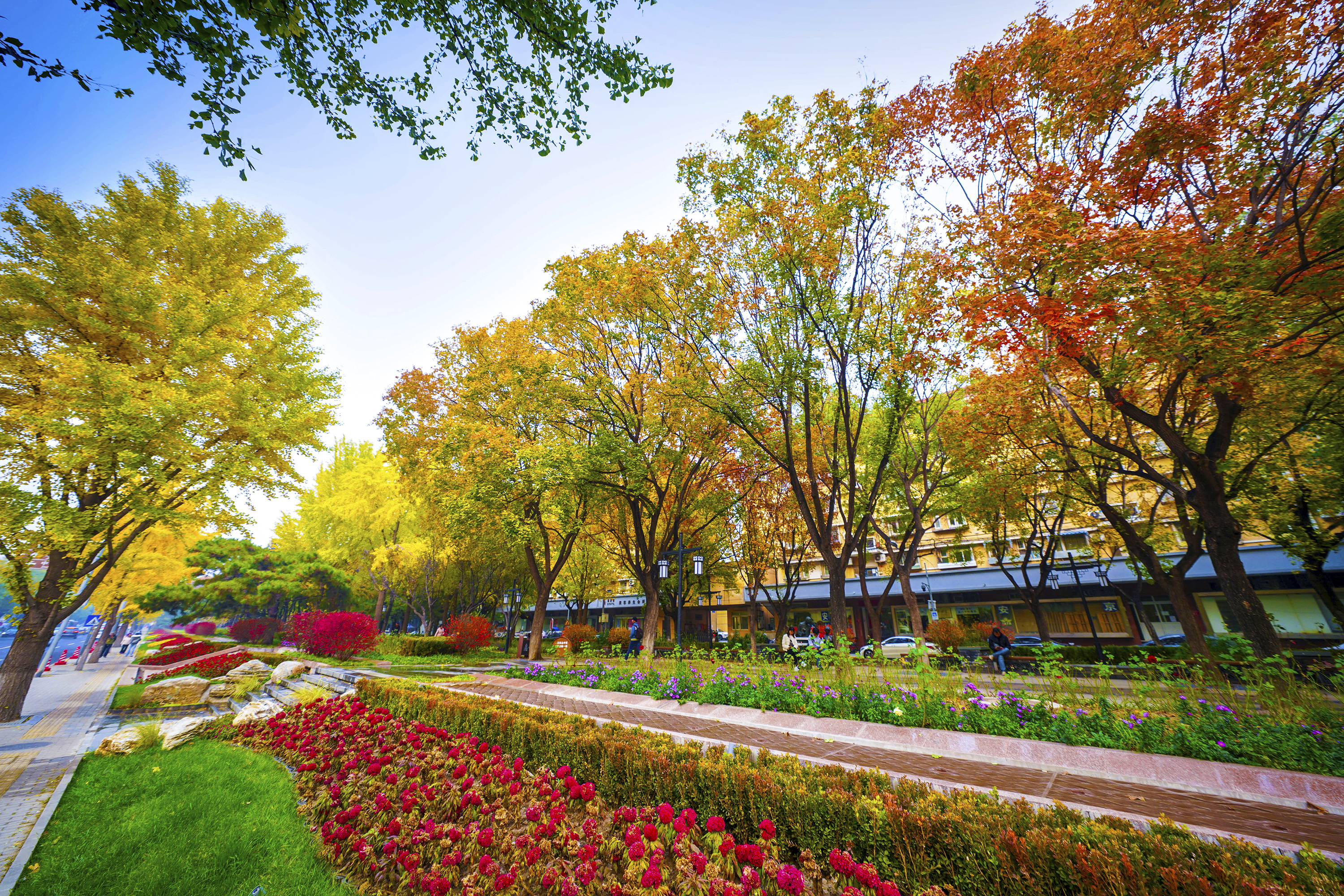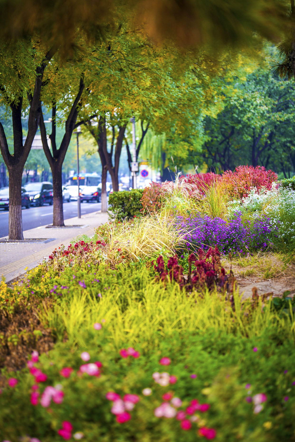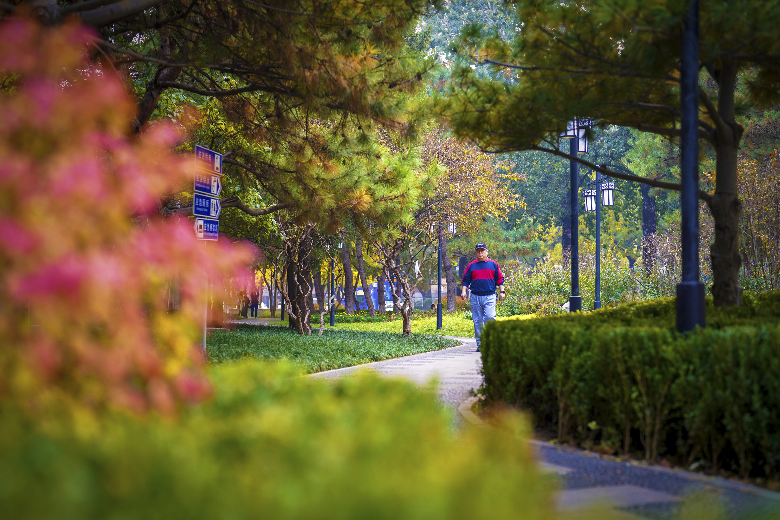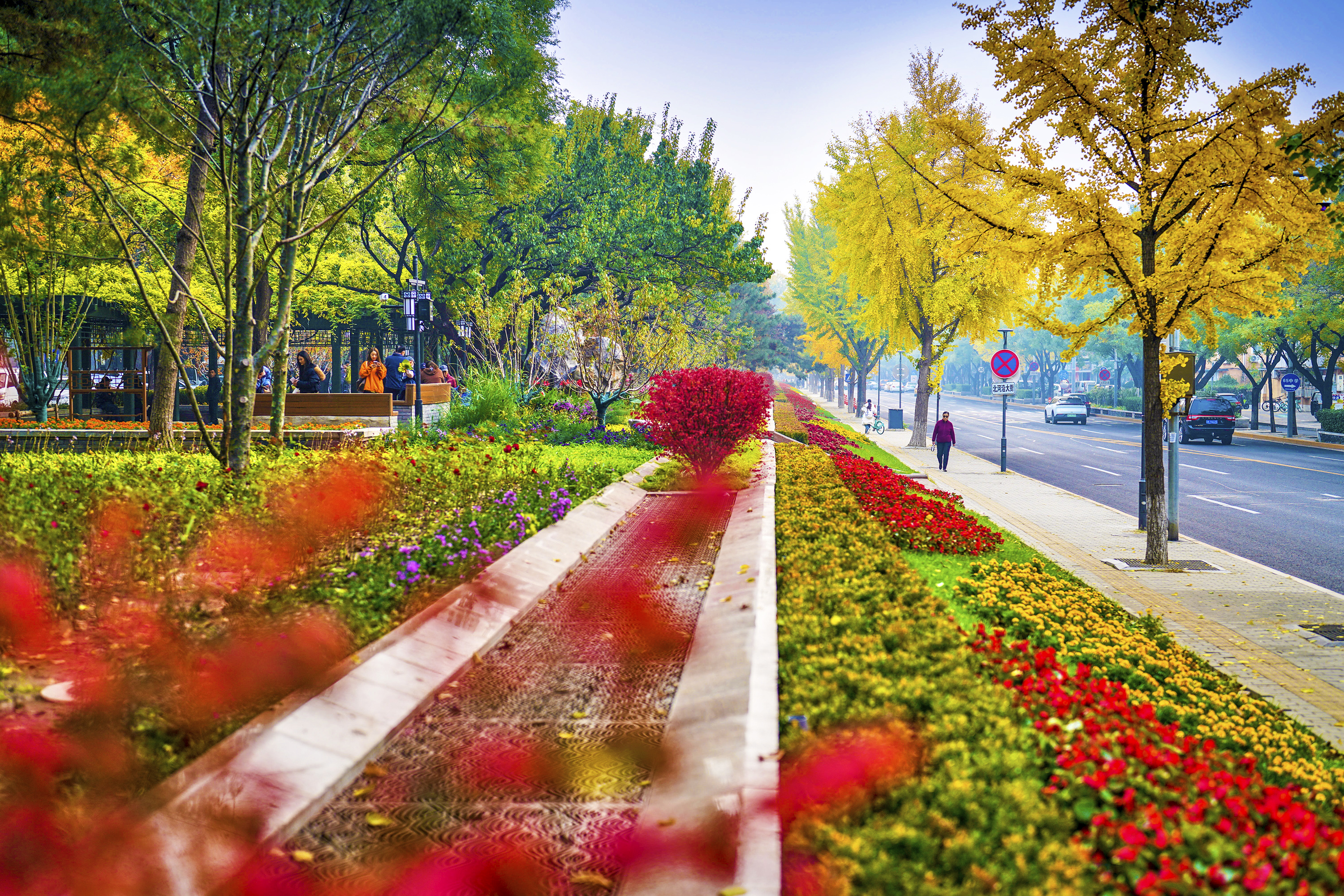沿步道徐行,仿佛走入色彩的秘境——银杏的金、松柏的绿、黄栌的橙、元宝枫的红,层层晕染,交织成秋日的底色。各色应季花卉点缀其间,与林木相映,碰撞出丰富而斑斓的视觉韵律。