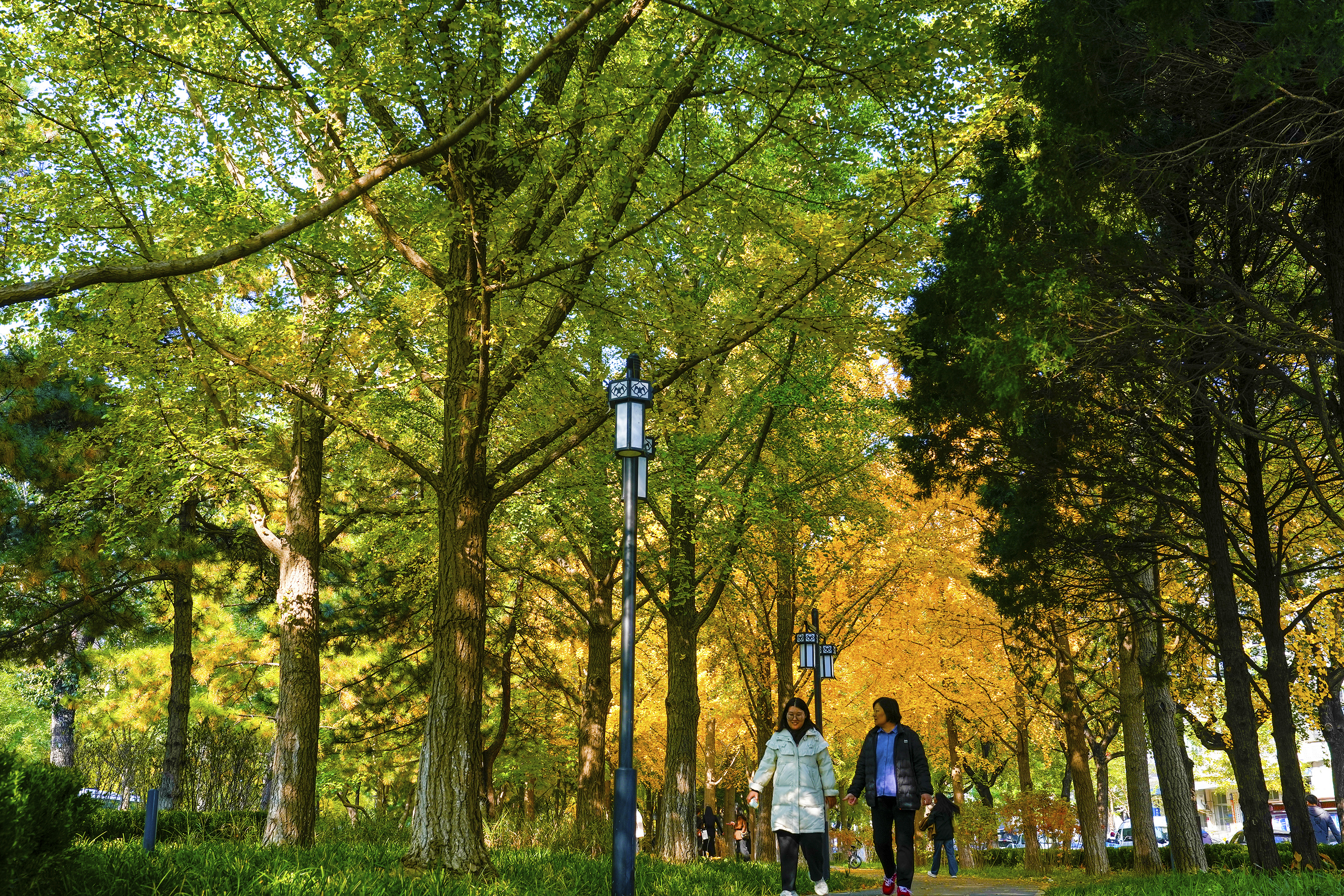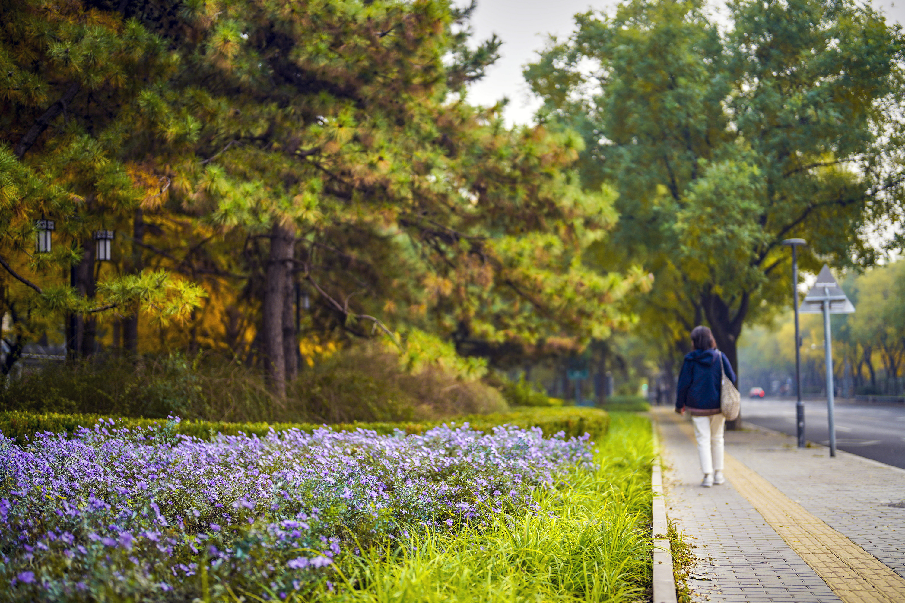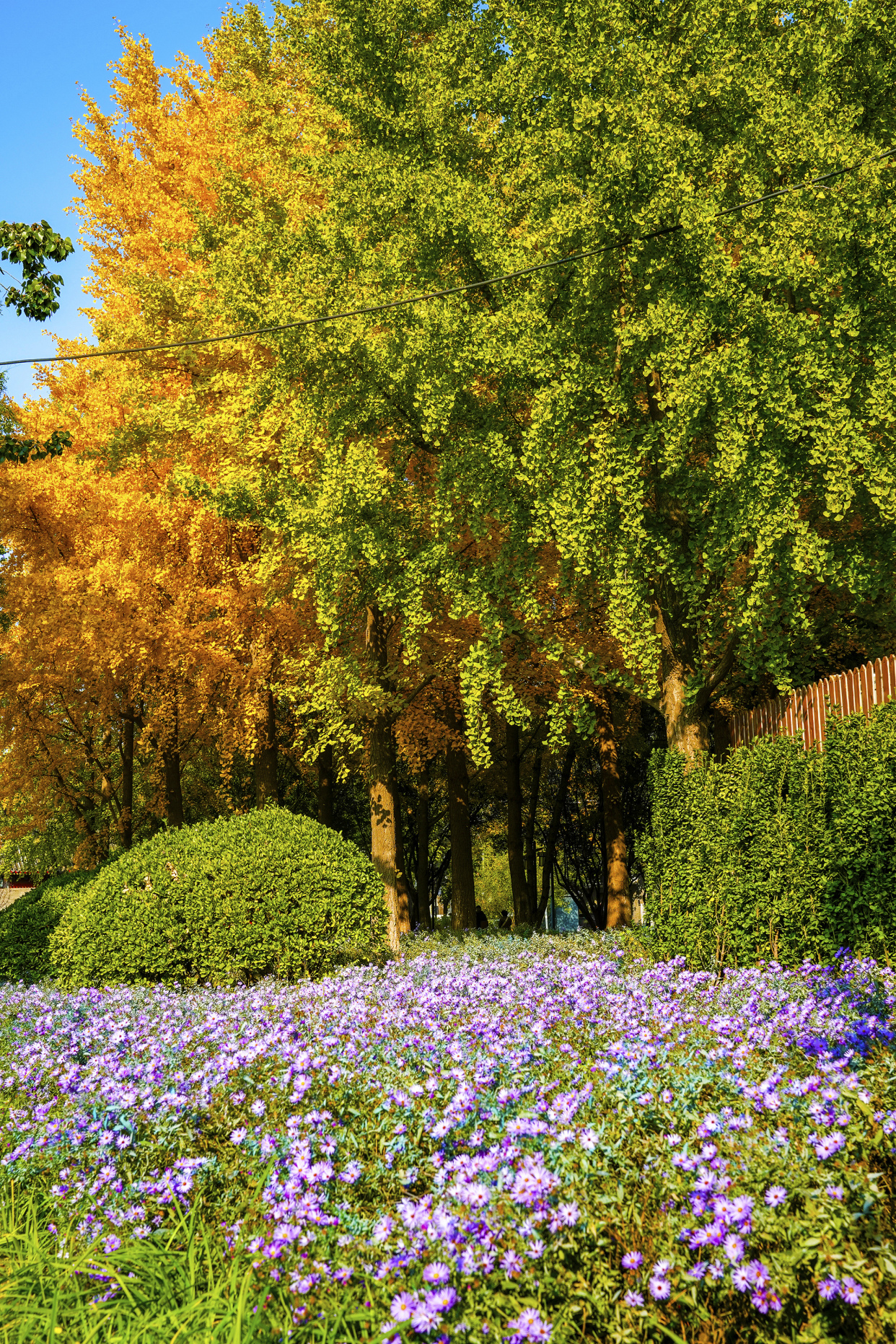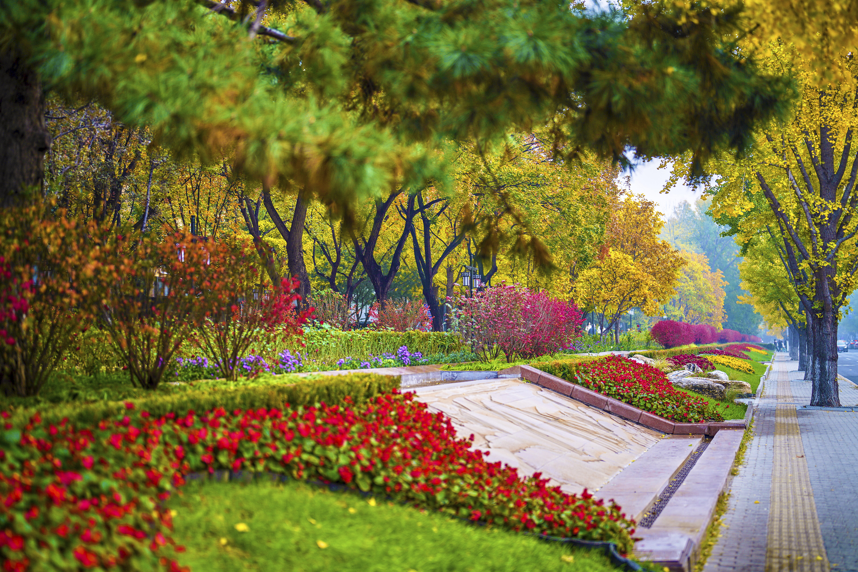沿步道徐行,仿佛走入色彩的秘境——银杏的金、松柏的绿、黄栌的橙、元宝枫的红,层层晕染,交织成秋日的底色。各色应季花卉点缀其间,与林木相映,碰撞出丰富而斑斓的视觉韵律。