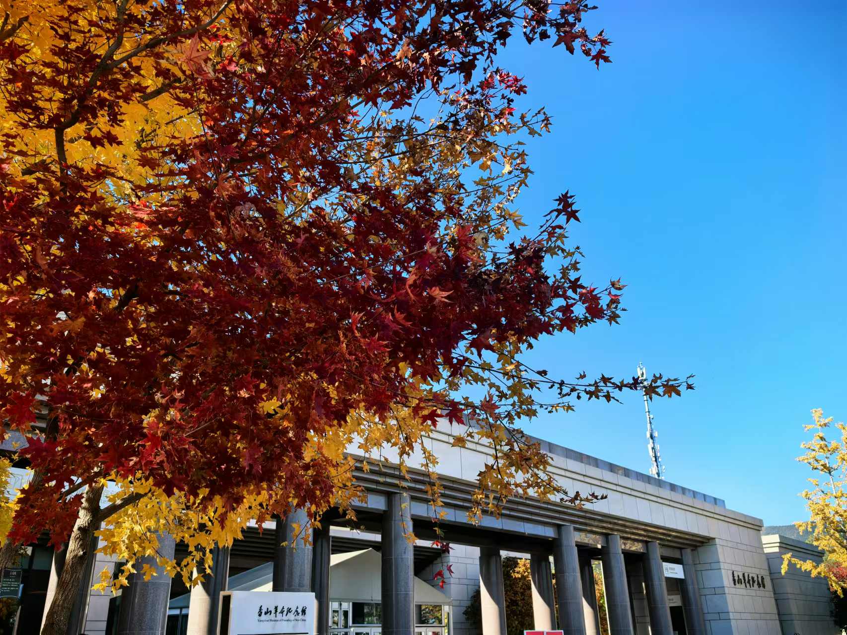 香山的秋,是红叶装点的革命画卷。香山革命纪念馆坐落于山脚下,漫山红叶如烽火漫卷、似赤霞流丹,每一片红叶都是岁月的信笺,铭记着那段“赶考”的峥嵘岁月。风吹叶动,仿佛历史的回响在耳边轻语。
