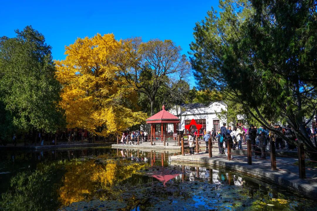 院内“古都春晓——中共中央‘进京赶考之路’颐和园专题展览”还原着当年的历史场景,院外秋景雅致清幽,漫步其间,既能赏“溪映秋林”的自然之美,亦能品革命岁月的红色底蕴,在山水秋色中感受历史与当下的深情共鸣。