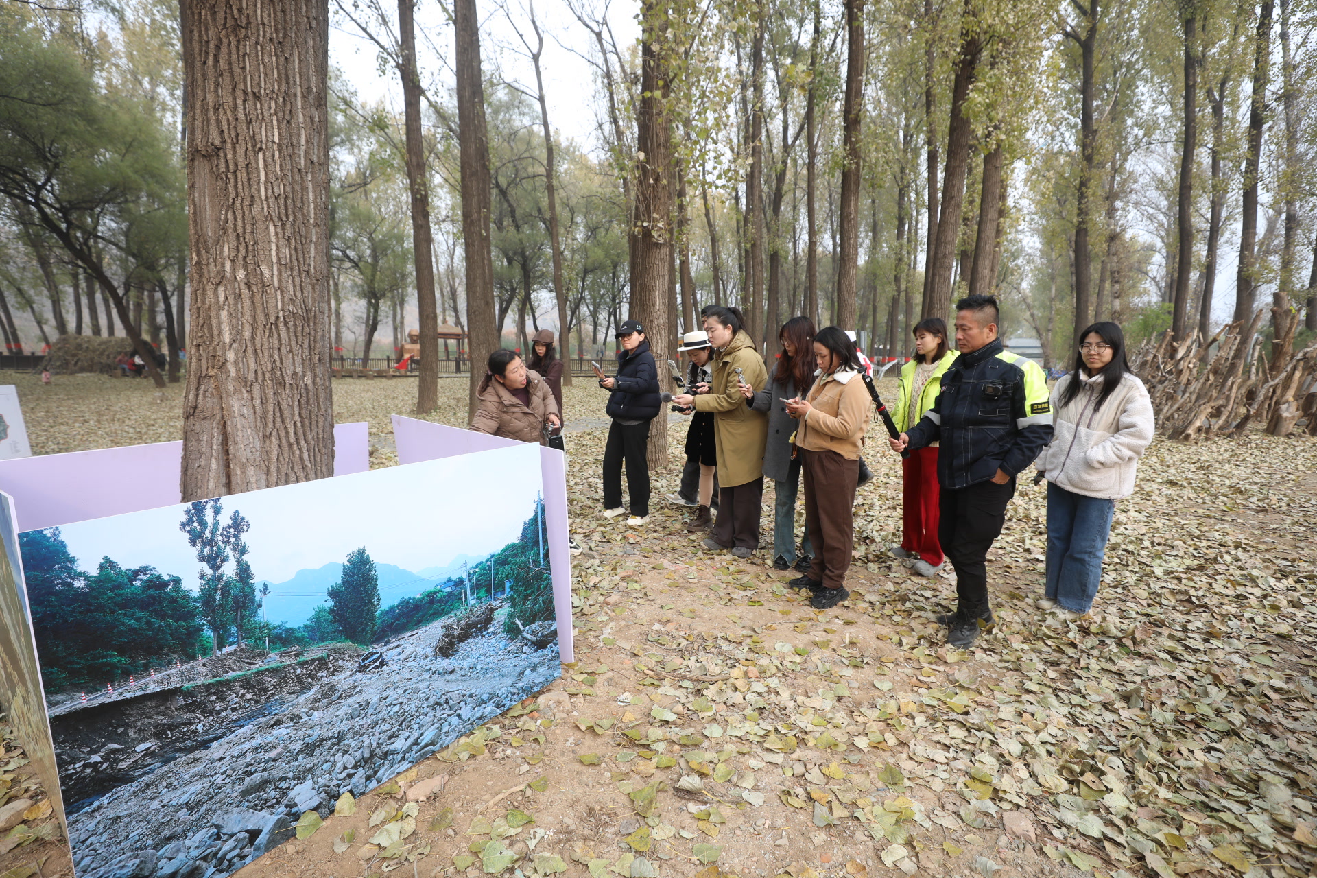 洪水冲倒的树木、淹没的餐车、被冲毁的汽车残骸……在关上村村西的一片林下空间,镇罗营镇特意打造了“重生”抗洪纪念展,30余件展品均来自洪灾现场,一张张图片,还原的也是村民们在洪水中经历的真实场景。