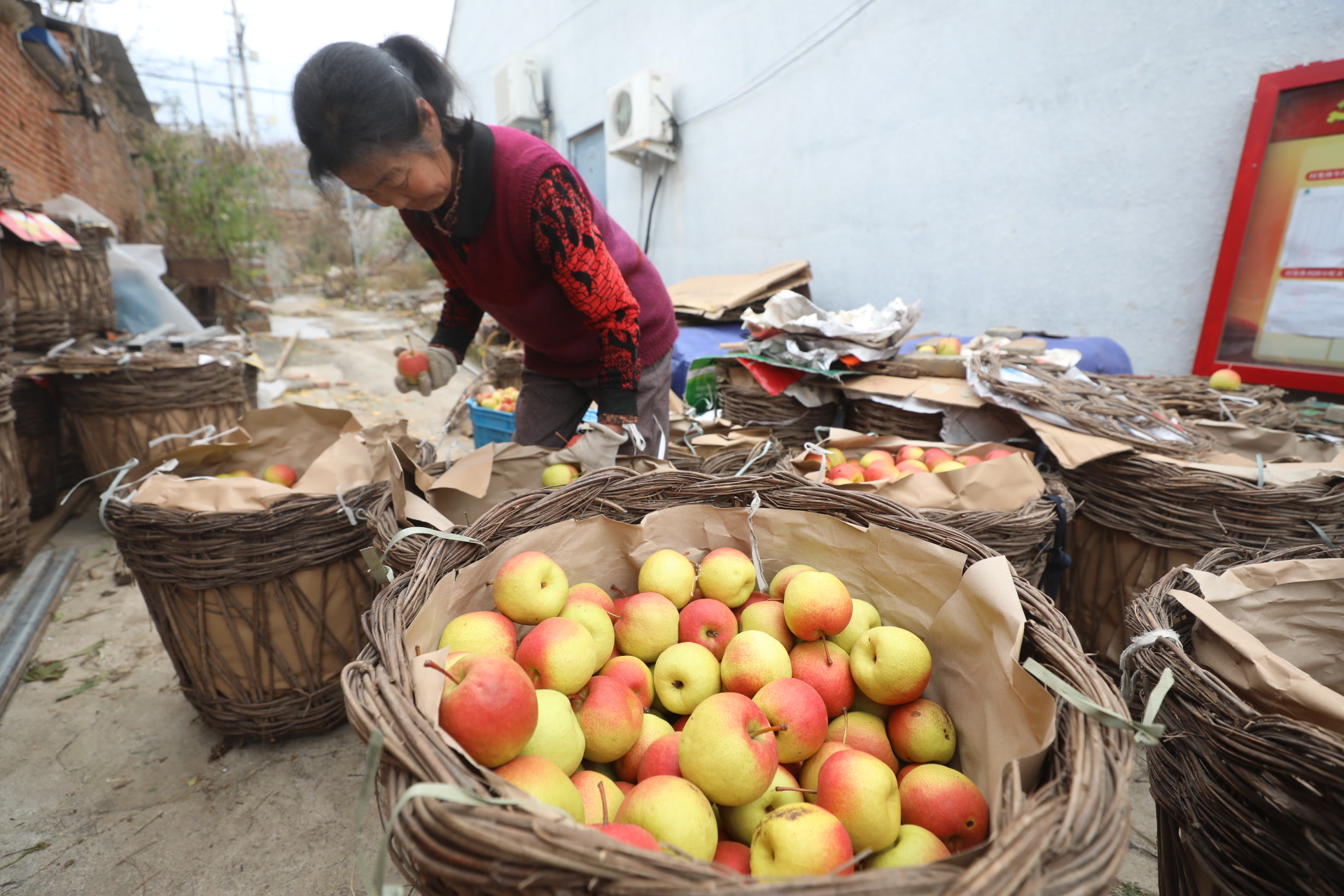 村民李永浩就住在镇罗营镇东寺峪村村委会边上。记者来到他家里时,他正在分拣一筐筐的红肖梨,把大果、小果分别堆放,熟透的、快熟的也区分开来。