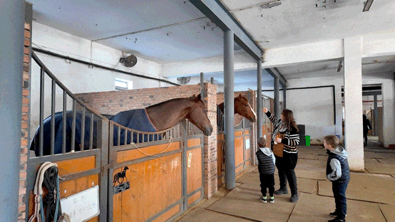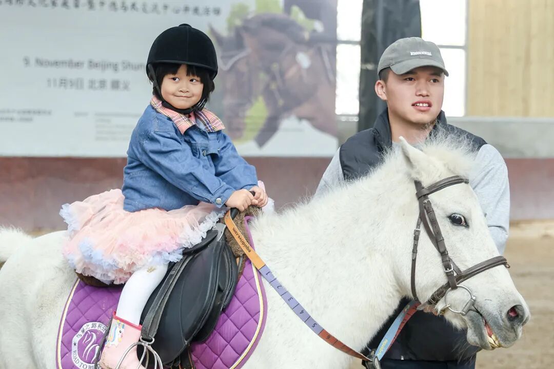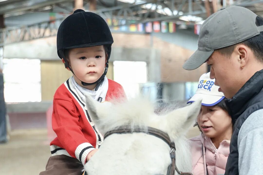 在亲子互动区内,教练们耐心地指导孩子们穿戴马术装备。孩子们坐在马背上,脸上满是兴奋与期待,在教练的引导下慢慢前行,感受着与骏马相处的快乐。
