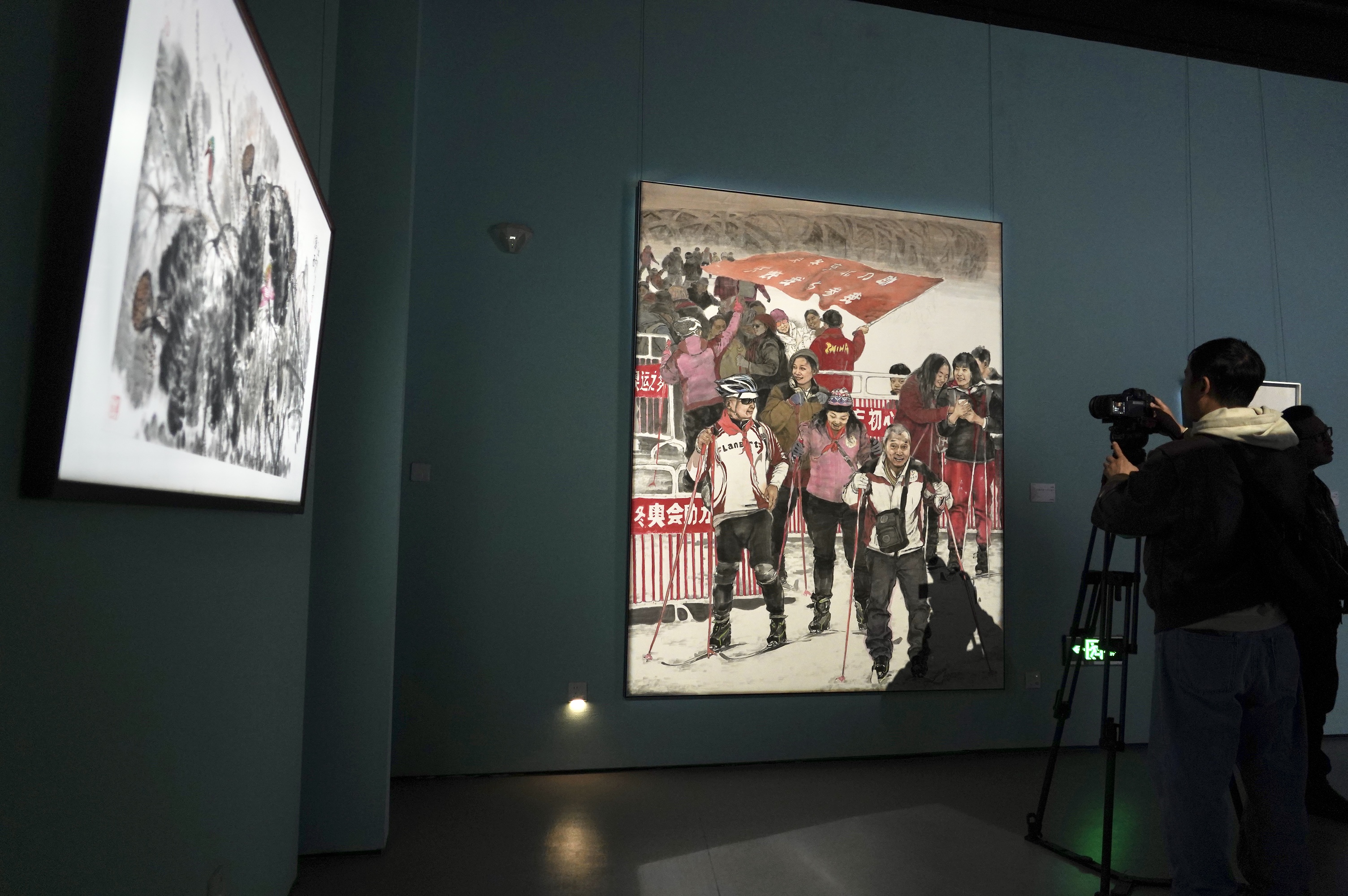 现场装置还设计了电子画册阅读屏,通过电子画册阅读屏参与互动呈现更为直观的获奖作品阅读体验,部分参展作者与朝阳区美术爱好者共同参与体验,并进行现场交流。