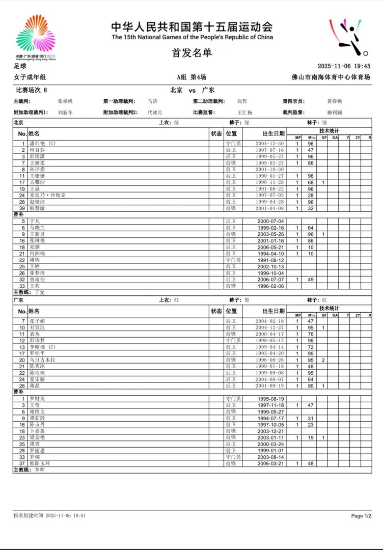 11月6日晚,第十五届全国运动会足球女子成年组A组第二轮开踢。北京女足0比1不敌东道主广东队。