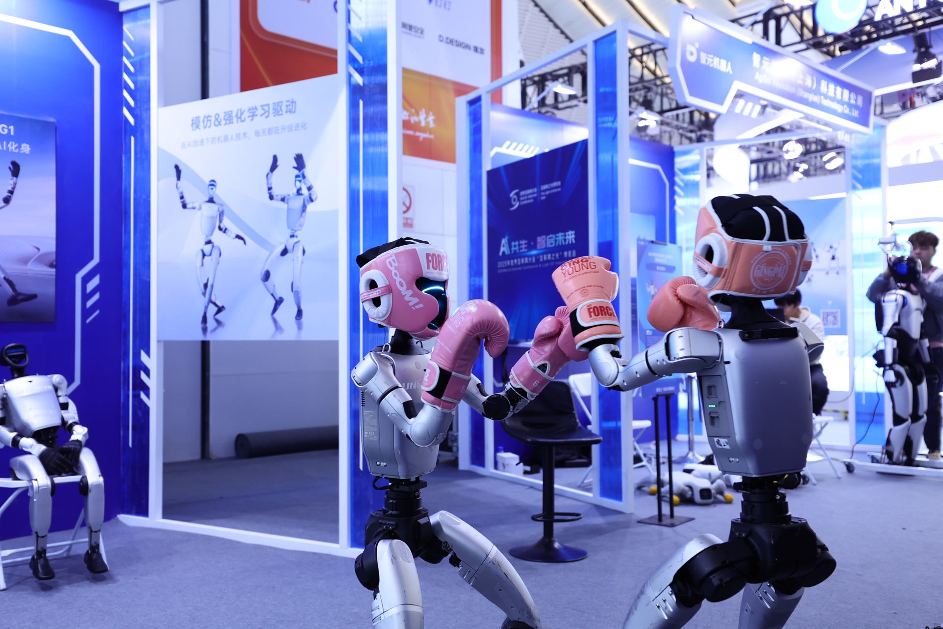 博览会另一侧,“Bot Show”机器人大秀人气高涨,观众不仅可以在这里近距离观看机器人演奏或者跳舞,还能与各类机器人聊天、握手,亲密互动。其中,一场宇树科技G1机器人格斗赛格外引人注目。戴着粉色拳击手套的机器人选手率先出拳,它的对手机器人也不甘落后,第一时间敏锐地捕捉到了对方动作,并侧身躲开,一招一式之间,引得观众连连喝彩。