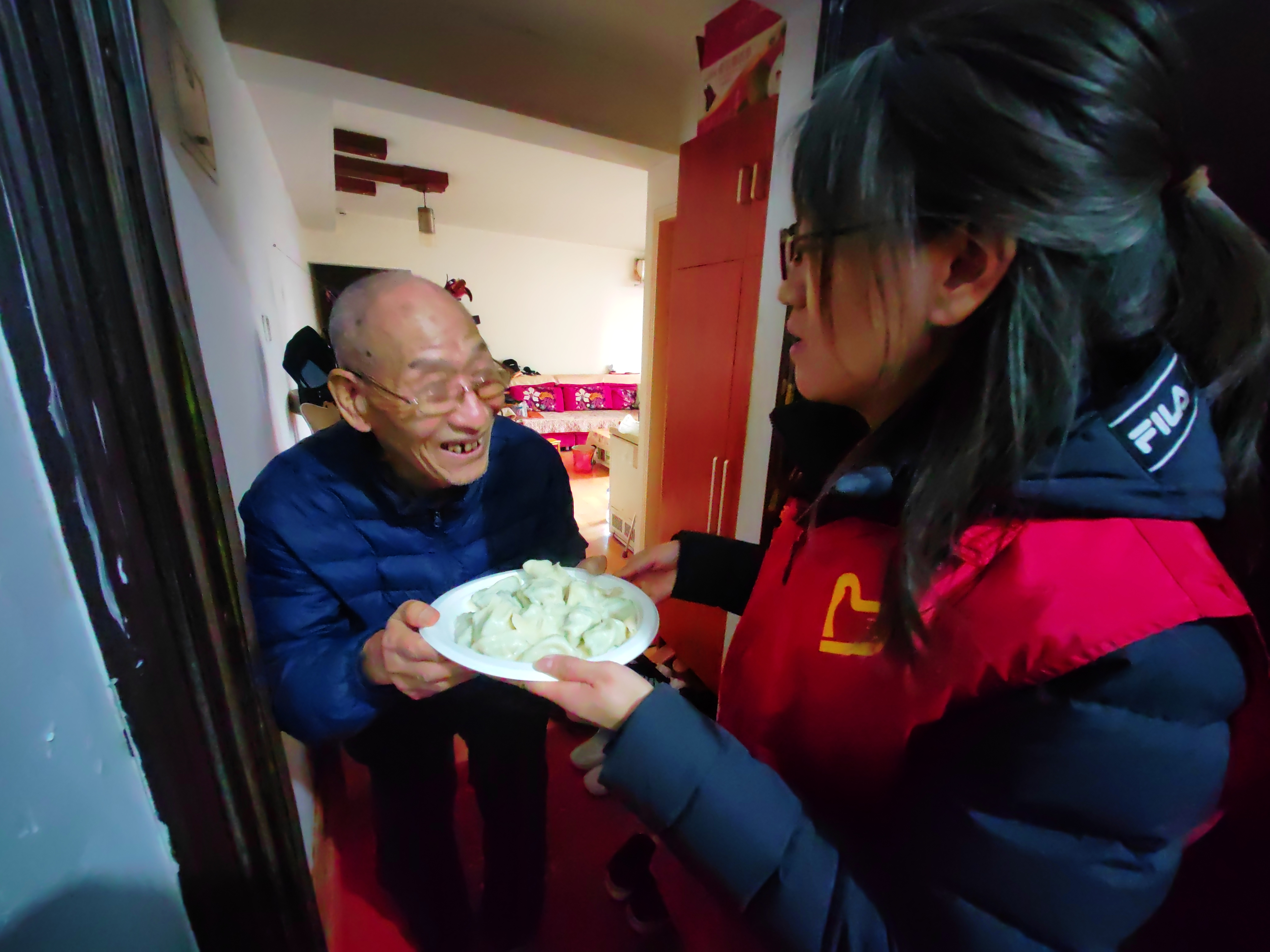 本次活动特别设置了 “温情上门” 传递环节,社工与志愿者组成爱心小分队,将现场制作的热气腾腾的饺子精心分装打包,登门走访社区内的孤寡老人、空巢老人家庭,为他们送上冬日的温暖与节日的祝福。志愿者们还与老人们亲切交谈,询问身体状况与生活需求,用贴心的陪伴让老人们感受到社区大家庭的关爱。