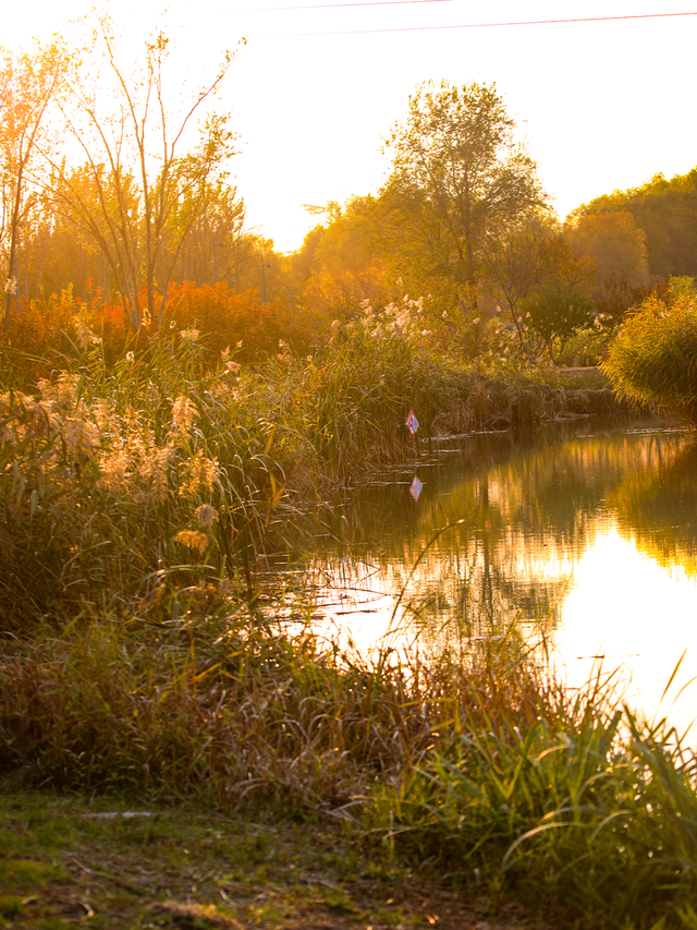 傍晚时分,夕阳的余晖染上苇丛