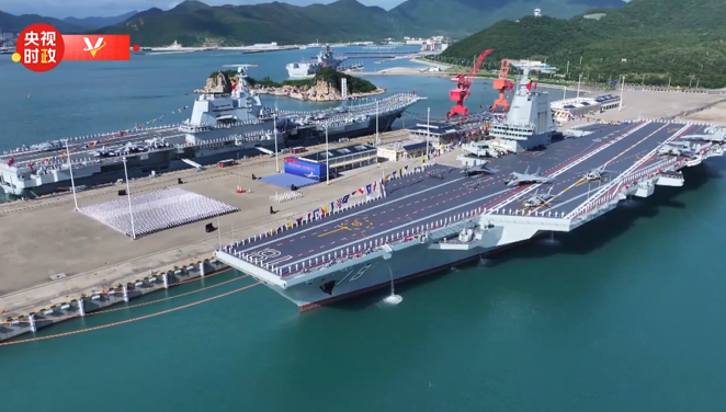 我国第一艘电磁弹射型航空母舰福建舰入列授旗仪式5日在海南三亚某军港举行。山东舰在现场见证,祝贺福建舰入列!