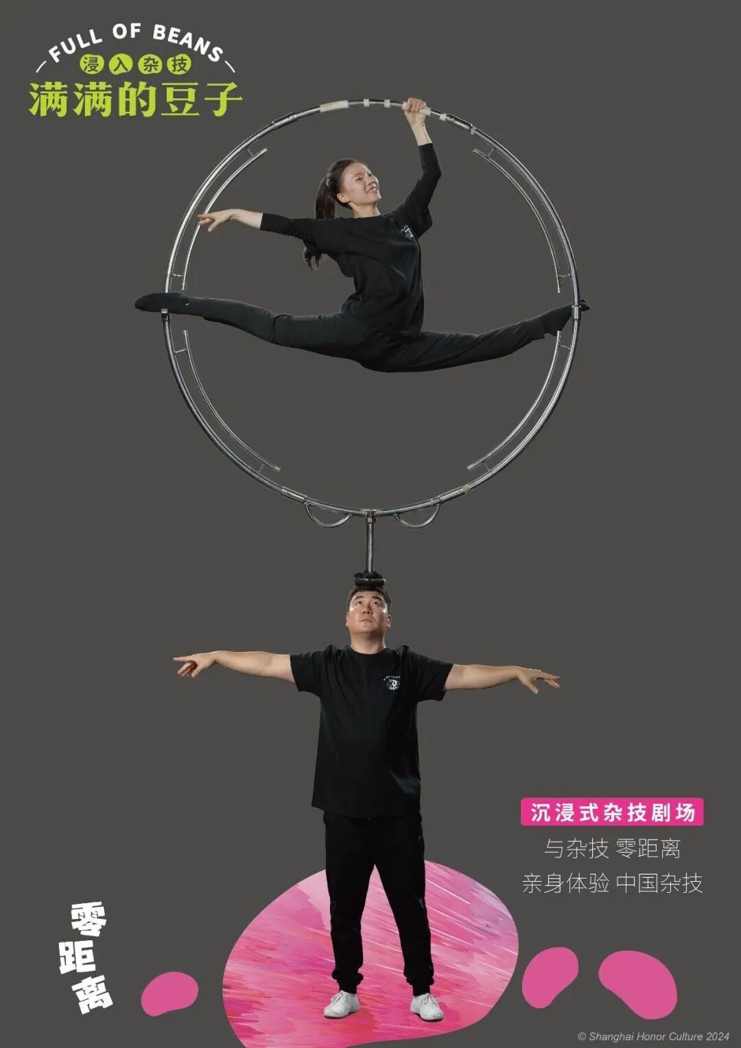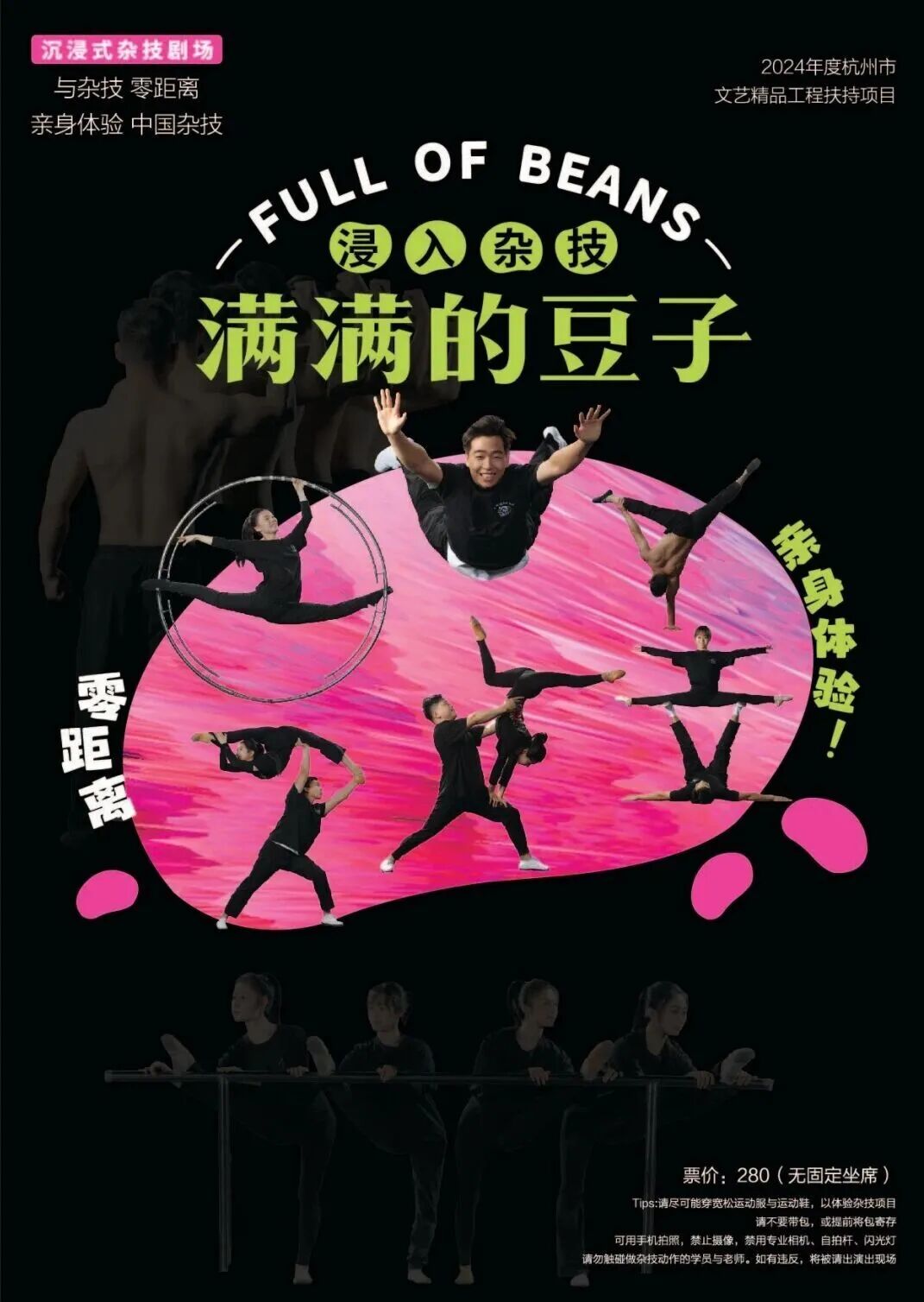 《满满的豆子》是全沉浸的杂技体验。观众将成为杭州杂技总团的“学员”,浸入杂技团的排练房,在排练房里亲身体验杂技演出的项目,在杂技老师的指导下试试转碟、玩玩空竹。作为杂技学员,更可以零距离观看杂技团的老师们表演高难度杂技项目。