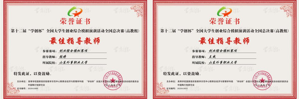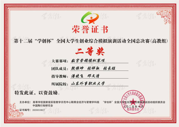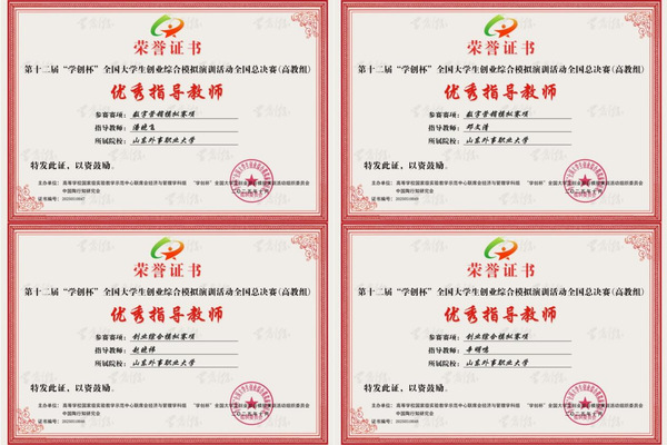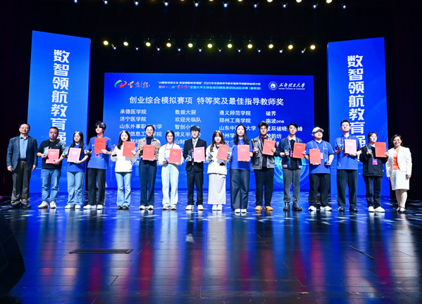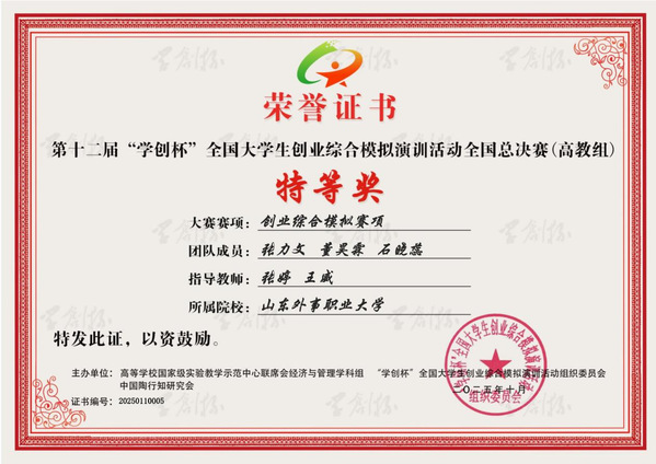 本届大赛规模创历届之最,参赛院校超过1500所,参赛团队逾12万支,参与师生近30万人。经过校赛、省赛、复活赛及全国半决赛的层层选拔,最终共有221所高校的287支队伍晋级全国总决赛。经过激烈角逐,学校人工智能学院“智创小组队”(成员:张力文、董昊霖、石晓蕊)荣获创业综合模拟赛项全国特等奖;国际商学院“小白一枚队”(成员:王仪鑫、张岱翎、王欣颖)获创业综合模拟赛项全国二等奖;管理工程学院“菜鸟集结营队”(成员:殷振坤、张祥淑、张长旺)获数字营销模拟赛项全国二等奖。张婷、王威获“最佳指导教师奖”,潘晓飞、邓文清、赵晓祎、辛明鸣获“优秀指导教师奖”。