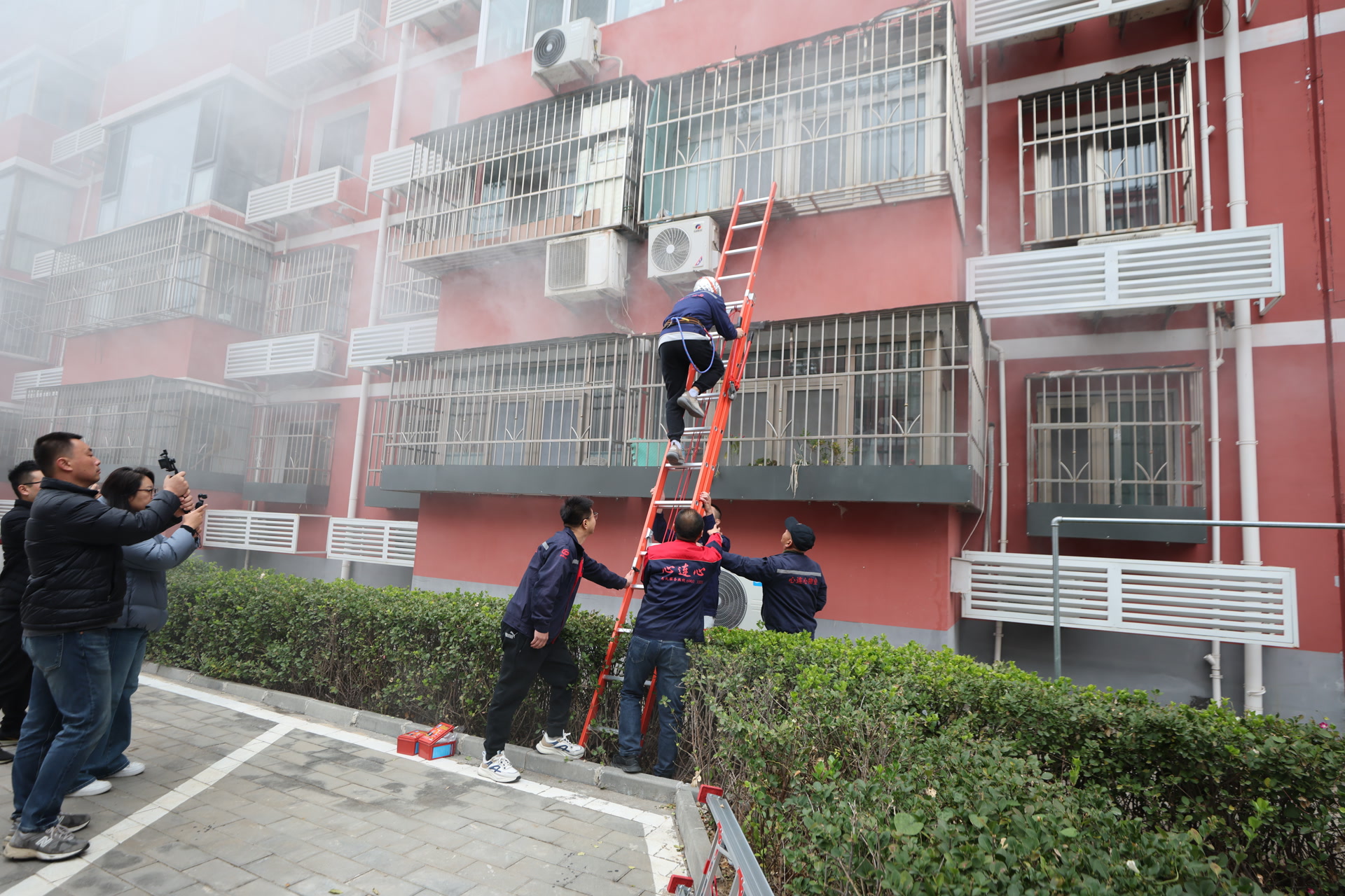 当天发放环节后,东菜园小区物业工作人员开展“救人三件套”疏散救人实战演练。演练模拟一栋居民楼的二层突发火情且部分居民被困的紧急场景,物业巡查人员发现“火情”后,第一时间携带“救人三件套”赶往现场。