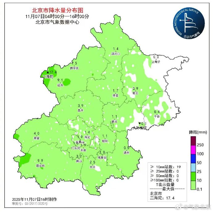 今天(7日)我市出现小雨,延庆等高海拔山区出现降雪。7日04时至16时,全市平均降水量2.5毫米,城区平均1.4毫米,最大降水量在延庆二海坨17.4毫米。