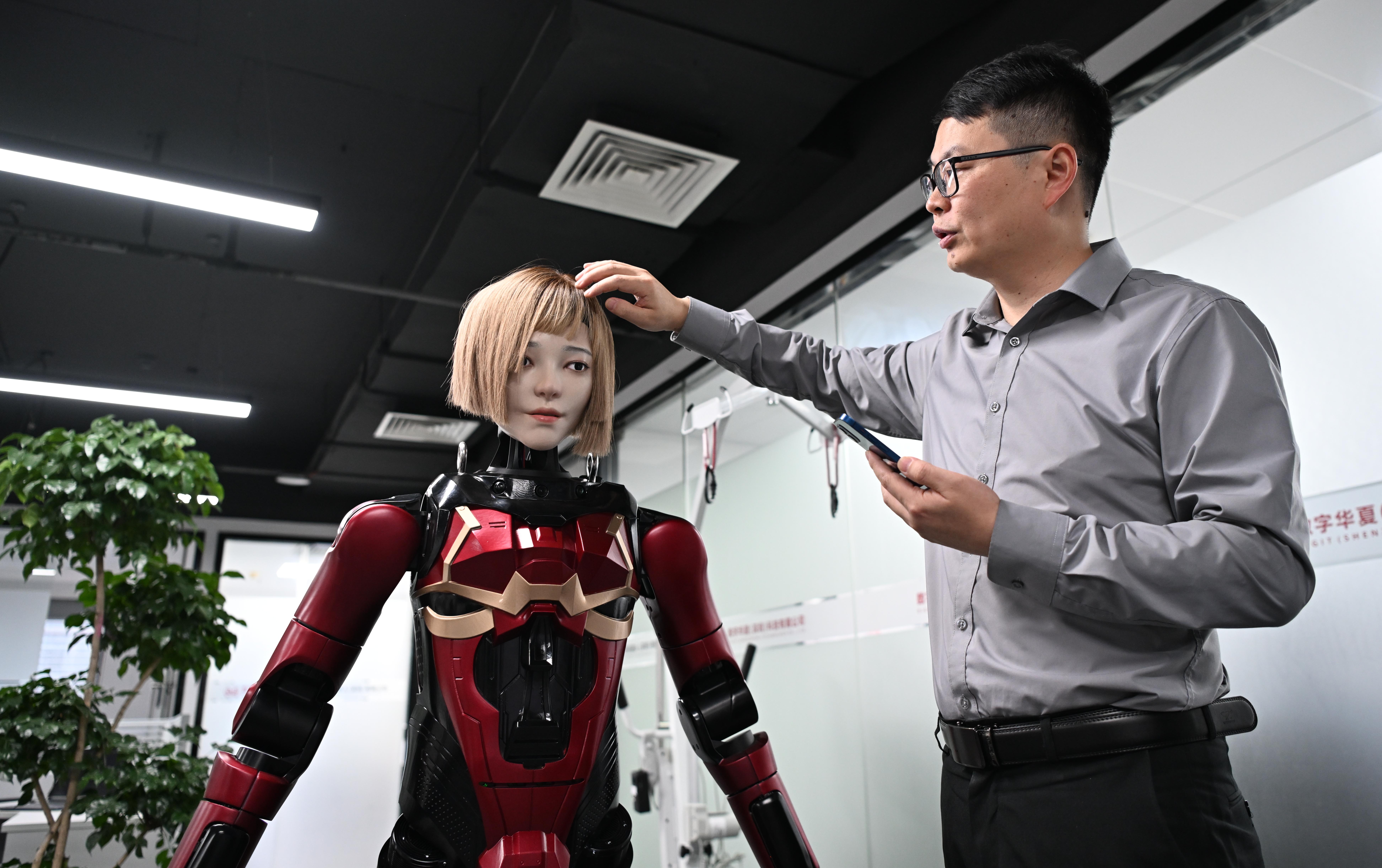 在数字华夏(深圳)科技有限公司,工作人员展示人形机器人夏澜(2025年3月27日摄)。新华社记者 邓华 摄