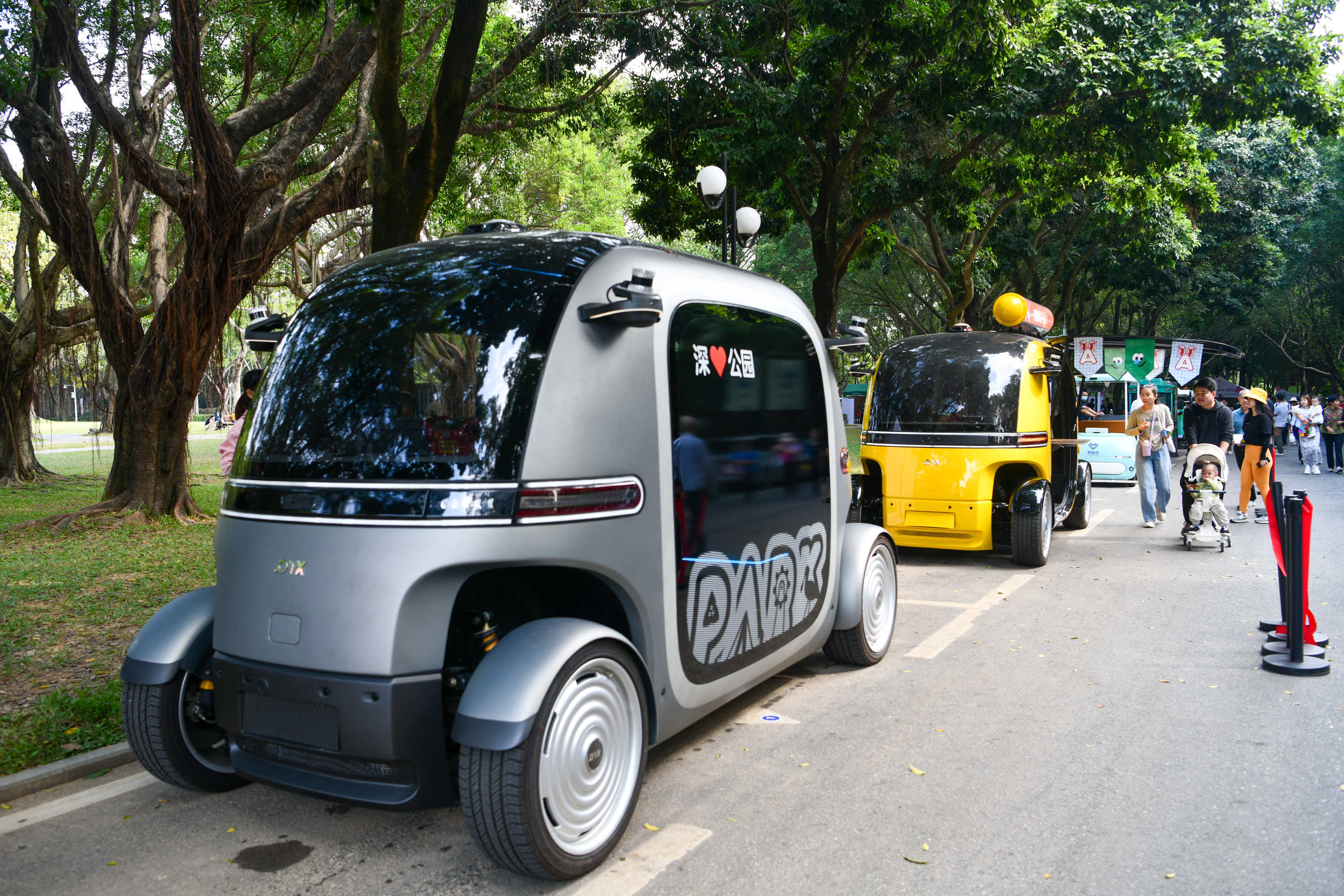 这是2024年11月11日在深圳莲花山公园拍摄的无人驾驶观光车、零售车。新华社记者 梁旭 摄