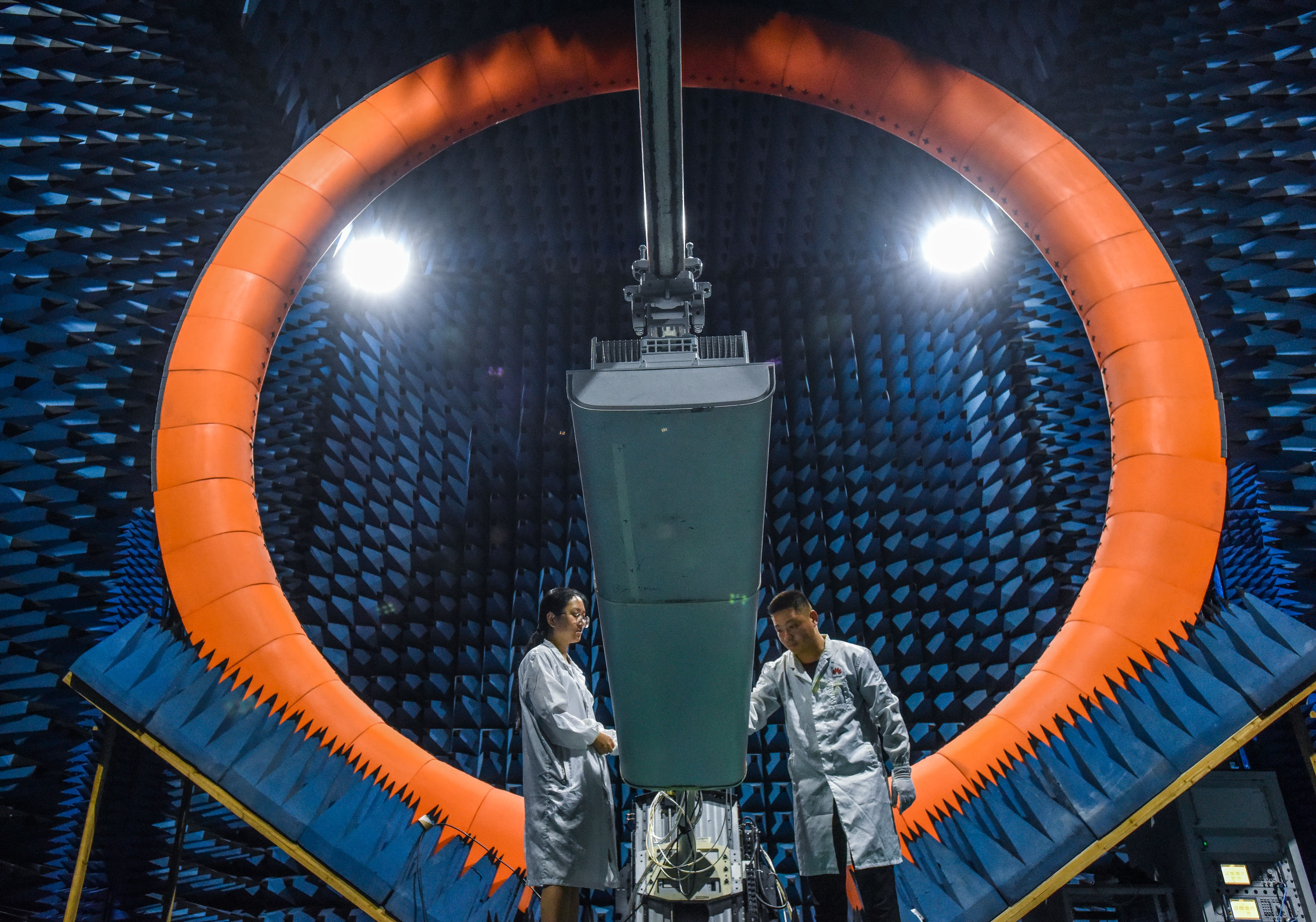 工程师在位于广东省东莞市松山湖的华为实验室测试5G基站设备(2020年7月3日摄)。新华社记者 刘大伟 摄