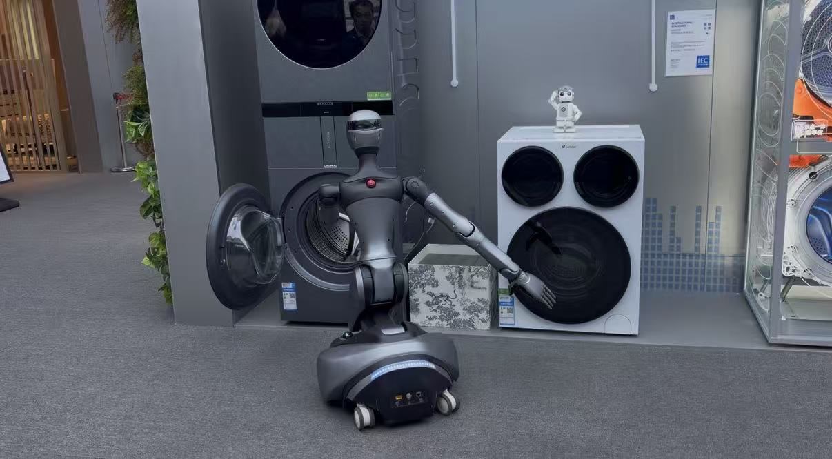 “快看,机器人真的在洗衣服!”十来名观众围着一台轮式机器人,只见它正弯腰从篮中取衣,熟练地放入洗衣机。这是海尔推出的“海娃”家务机器人,凭借灵巧的机械手,能完成洗衣、熨衣、叠衣等全套衣物护理工作。“要是真有它帮忙,家务可就轻松多了。”市民王女士感慨。