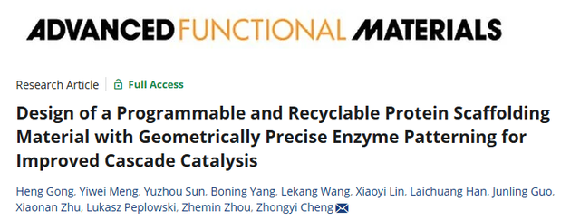 相关研究成果以 “Design of a Programmable and Recyclable Protein Scaffolding Material with Geometrically Precise Enzyme Patterning for Improved Cascade Catalysis” 发表于国际知名期刊《先进功能材料》(Advanced Functional Materials)。