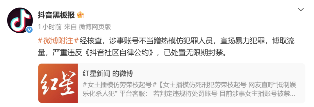 对此,抖音黑板报官方微博发文称,经核查,涉事账号不当蹭热模仿犯罪人员,宣扬暴力犯罪,博取流量,严重违反《抖音社区自律公约》,已处置无限期封禁。