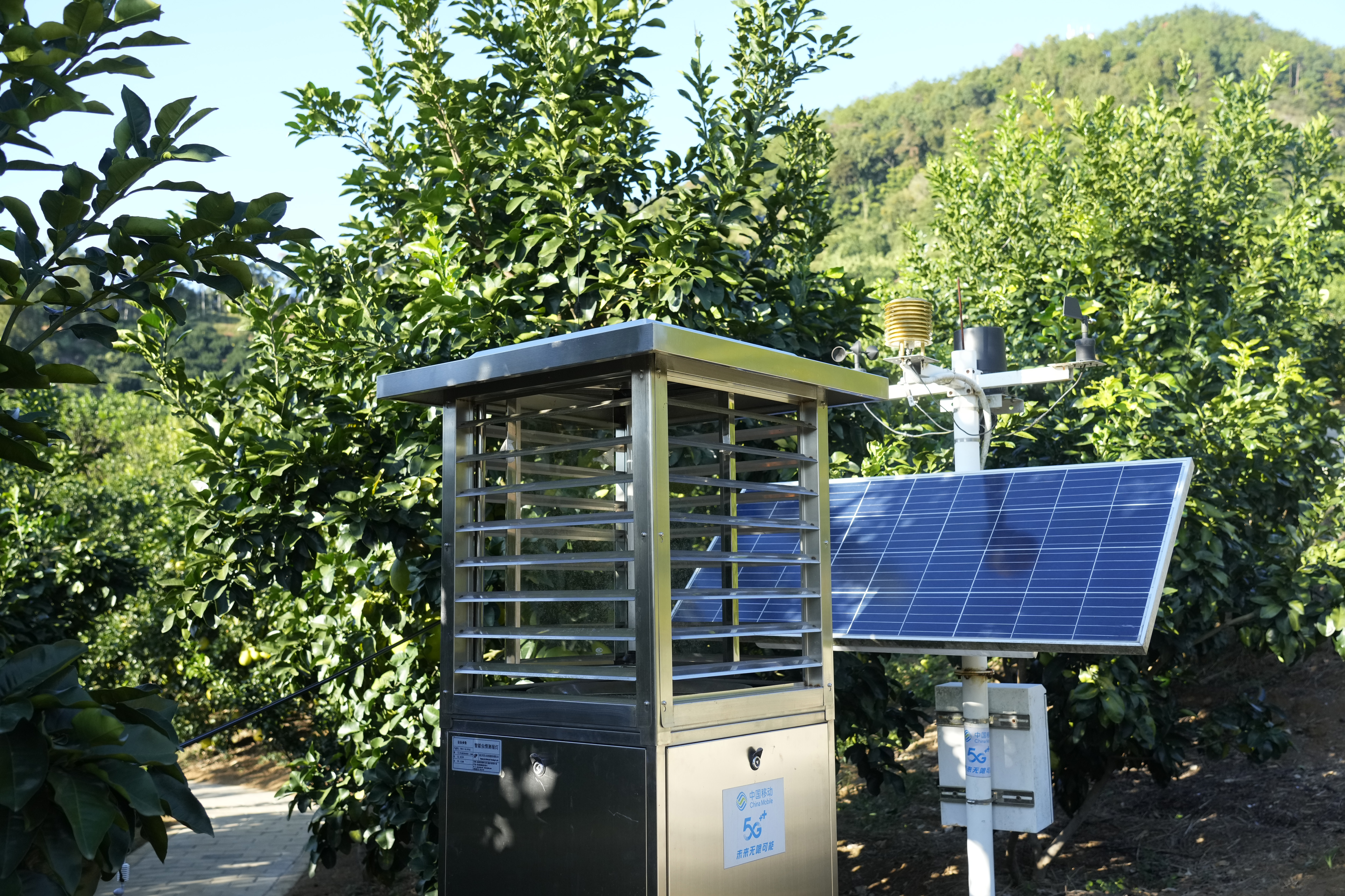 这是11月7日在梅州南福金柚种植基地拍摄的智能虫情测报灯。在智慧农业数字化平台的帮助下,柚农可通过手机实时监测分析土壤、气候、温度、湿度等重要指标。