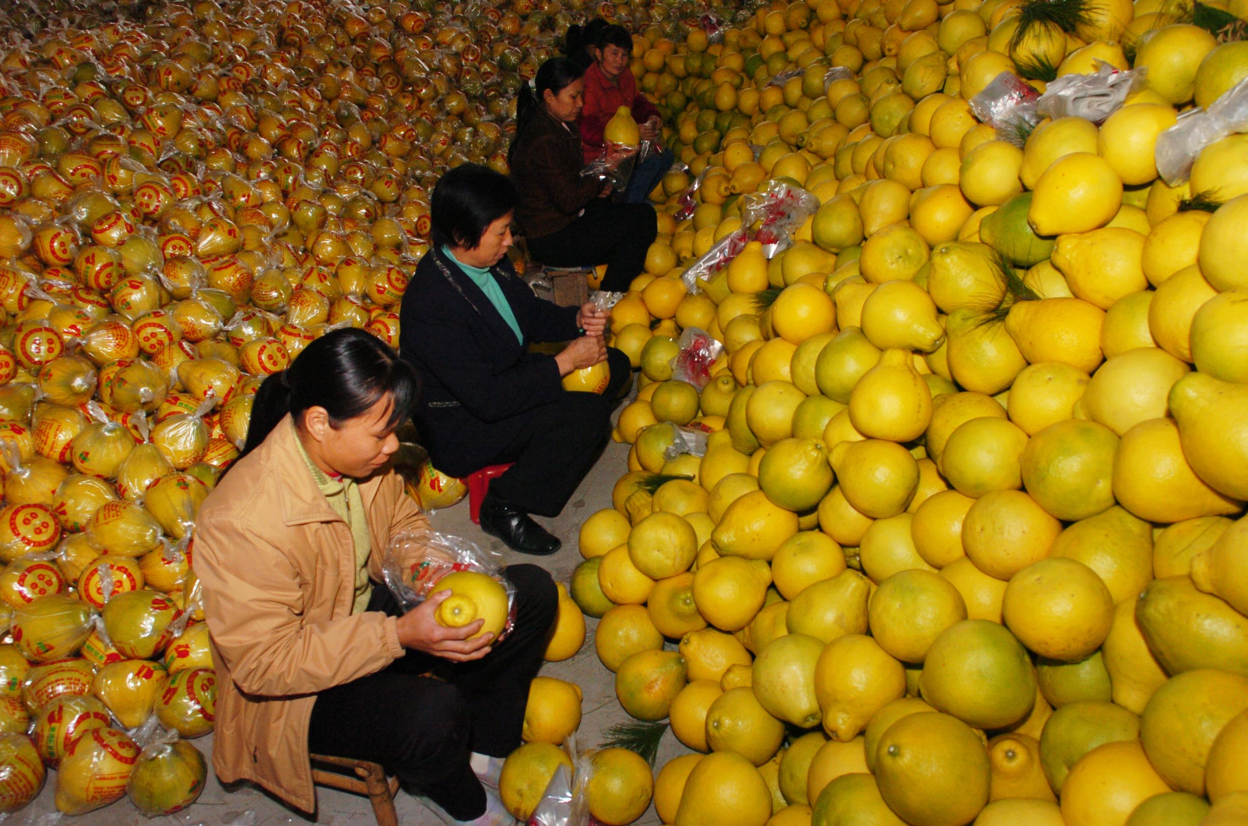 2007年12月1日,广东省梅县农民在包装柚子。