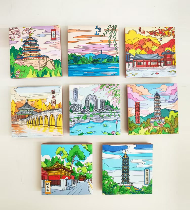 三山五园陶瓷冰箱贴,售价25元,以 “三山五园” 皇家园林为灵感,香山红叶的绚烂、玉泉山的静谧、万寿山的庄重,都被凝练在小小瓷片上。它采用高温釉彩手绘,融合青绿山水与珐琅彩工艺,每一枚都像件微型艺术品,贴在冰箱上,既是家居装饰,也是文化点缀。蔡琴选的“玉泉山款”,将玉泉山静明园的湖光塔影定格,诗意满满。