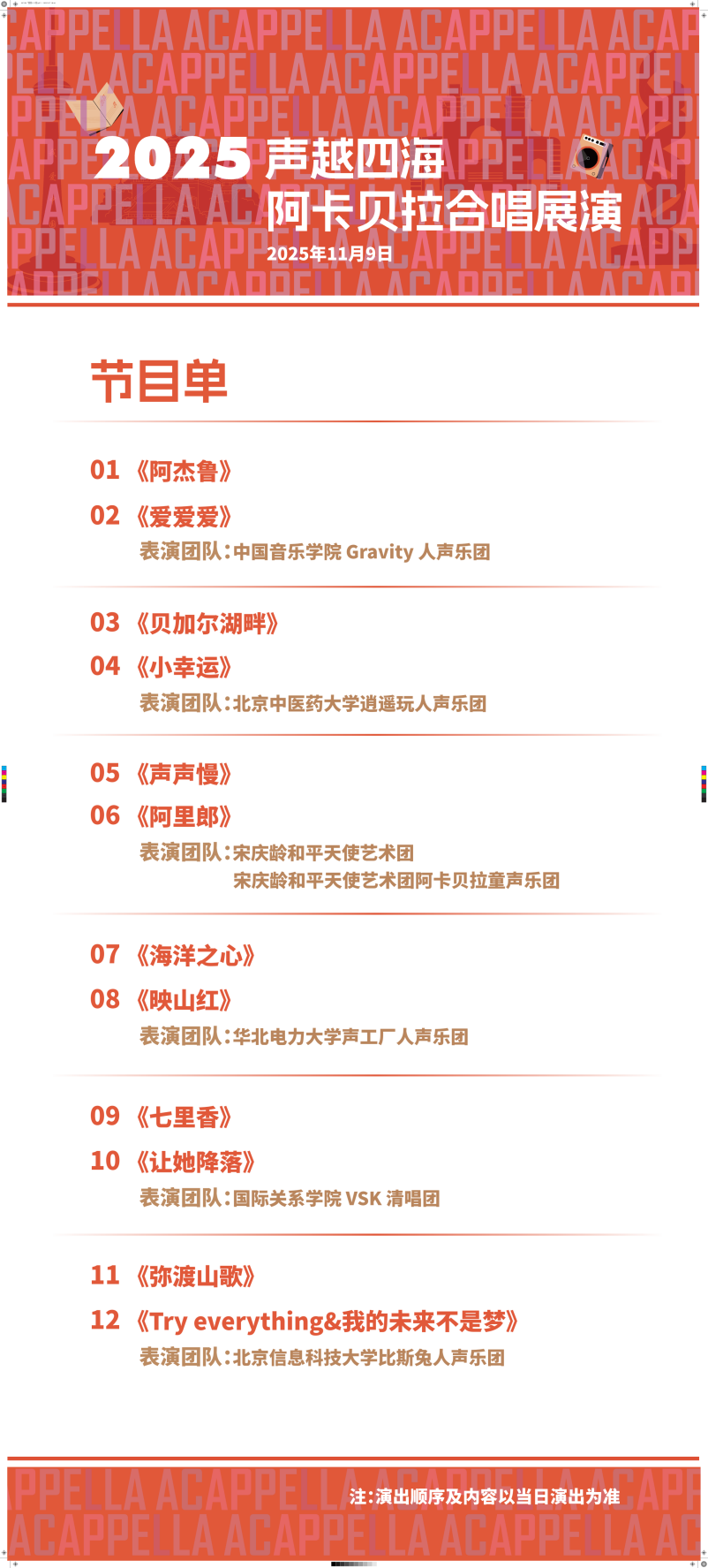 国图艺术中心专场没赶上?11月9日15时,2025年“声越四海”阿卡贝拉合唱展演第二场将在北京五棵松万达广场一层中庭举办。中国音乐学院Gravity人声乐团、华北电力大学声工厂人声乐团、国际关系学院VSK清唱团……各乐团将以面对面的方式,让您感受阿卡贝拉纯人声演唱的魅力。