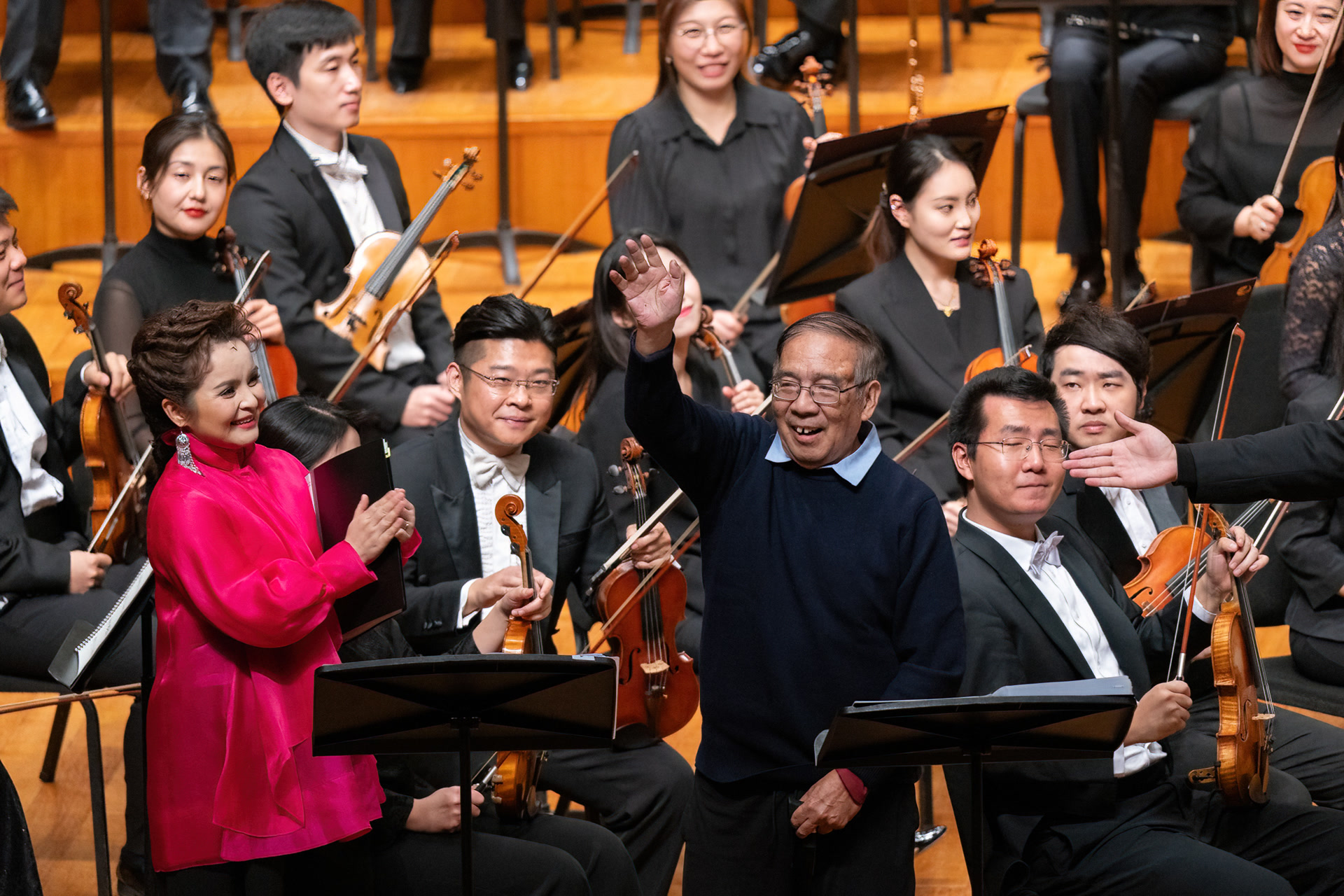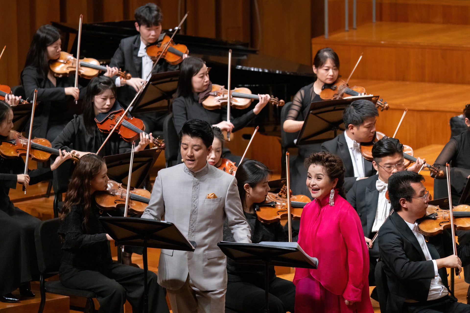 连续两天,指挥家钱骏平执棒国家大剧院管弦乐团、国家大剧院合唱团、北京爱乐合唱团,携手歌唱家吴碧霞、黄训国,以200余人的超大编制震撼“发声”。交响合唱版《炎黄风情》包含19首正曲,在保留《太阳出来喜洋洋》《茉莉花》《小河淌水》等耳熟能详段落外,纳入《安平怀古》《丢丢铜》等数首台湾民谣,同时补入四川《数蛤蟆》等汉族民歌经典,让作品在文化版图与情感表达上更趋完整。