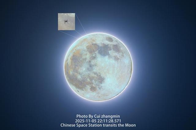 北京时间2025年11月5日22时11分28.571秒,搭乘六名航天员的中国空间站(CSS)以仅0.61秒的极短时间从“超级月亮”(本年度最大满月)飞过。当时,中国空间站距离地面约419.47公里,因轨道高度与“超级月亮”的双重叠加效应,其视觉大小较以往观测更为显著,这一瞬间稍纵即逝。这也是首次有摄影师拍下“超级月亮”与中国空间站同框。
