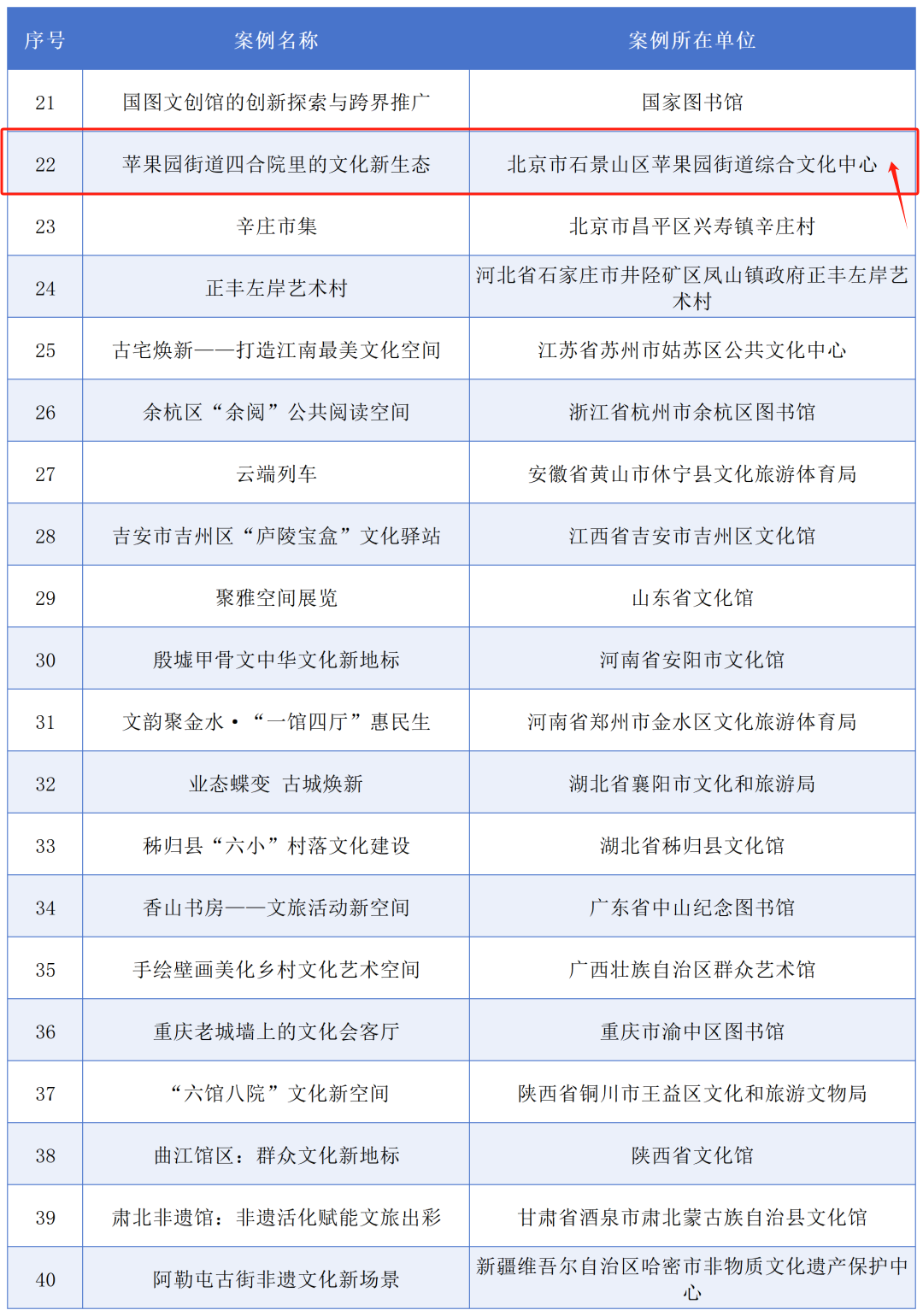 苹果园街道综合文化中心《苹果园街道四合院里的文化新生态》获评美好文化空间类创新案例。