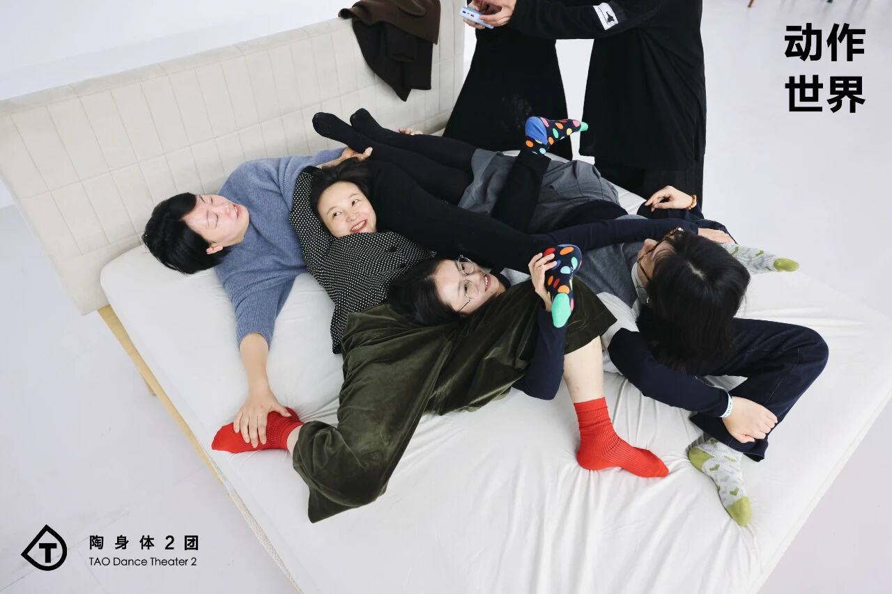 作为陶身体最具活力的原创作品,“动作世界”是一场等待观众一起参与共创的行为艺术实践。每一位观众并非单纯地“观看”,而是“在场”。引导者和观众的界限,也在一次次互动中悄然被打破。引导者作为温暖的媒介,与柔和的灯光、明快的色彩、充满想象的音乐共同营造出了一个“放松的空间”,邀请观众打开自我,重新感知身体的回响,就像小时候在家里,可以随意躺在沙发上,轻松而自在。